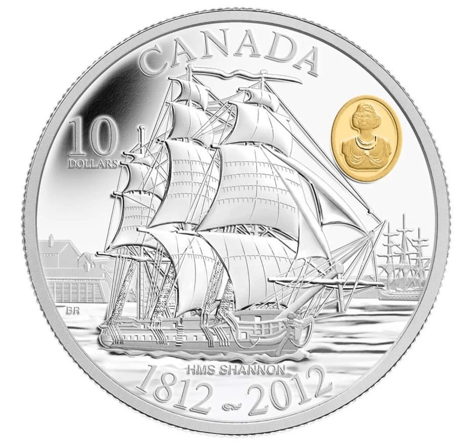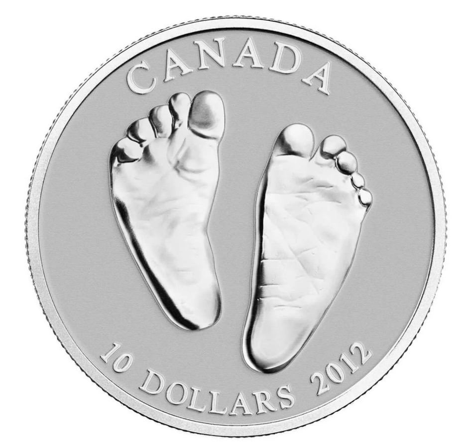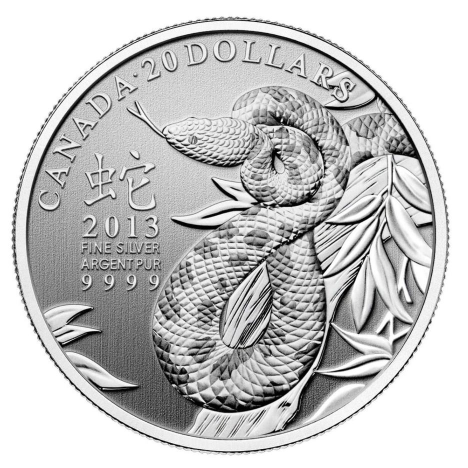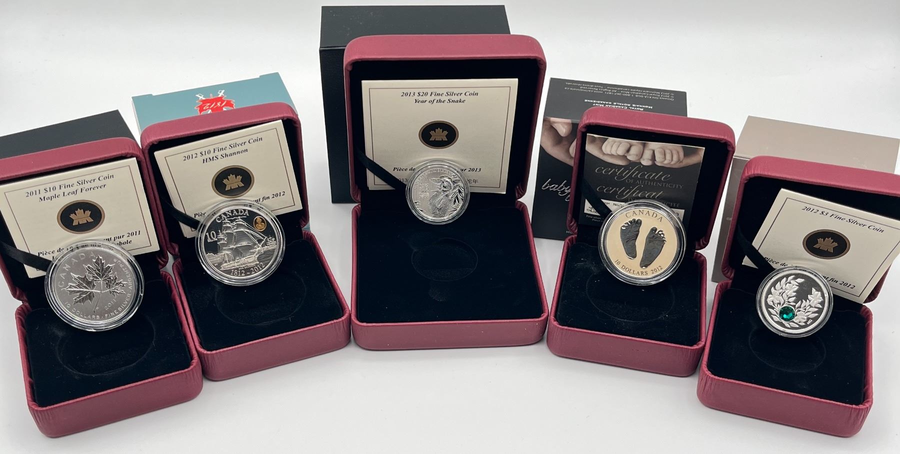 Includes: 2011 Maple Leaf Forever $10, 2012 Baby Feet $10, 2012 May $3 Birthstone, 2012 HMS Shannon $10, 2013 $20 Year of the Snake. 5 pcs.