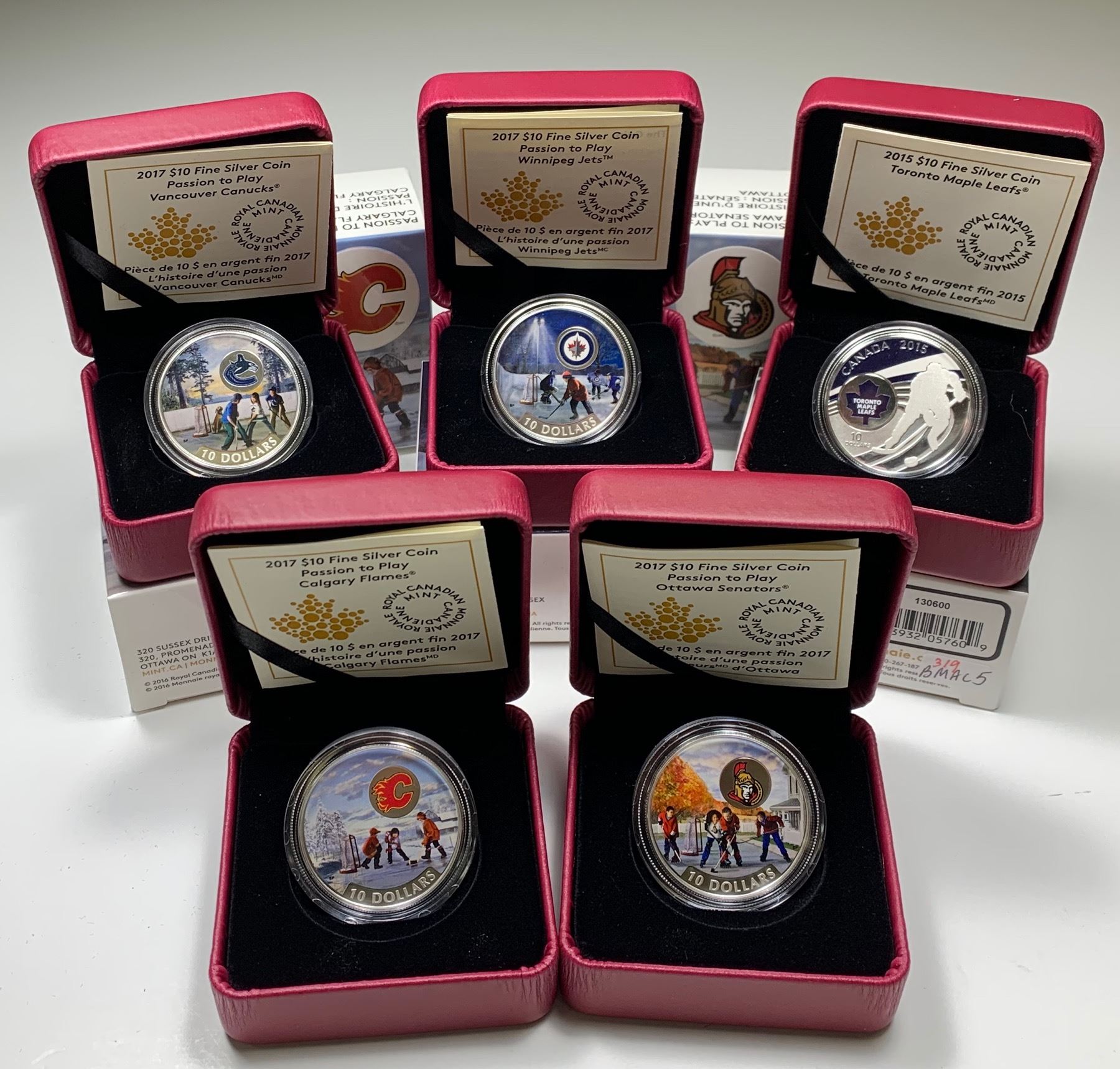 2015 $10 Toronto Maple Leafs; 2017 $10 Ottawa Senators; 2017 $10 Calgary Flames; 2017 $10 Vancouver Canucks; 2017 $10 Winnipeg Jets. All in original cases with COAs. 5 Pcs.