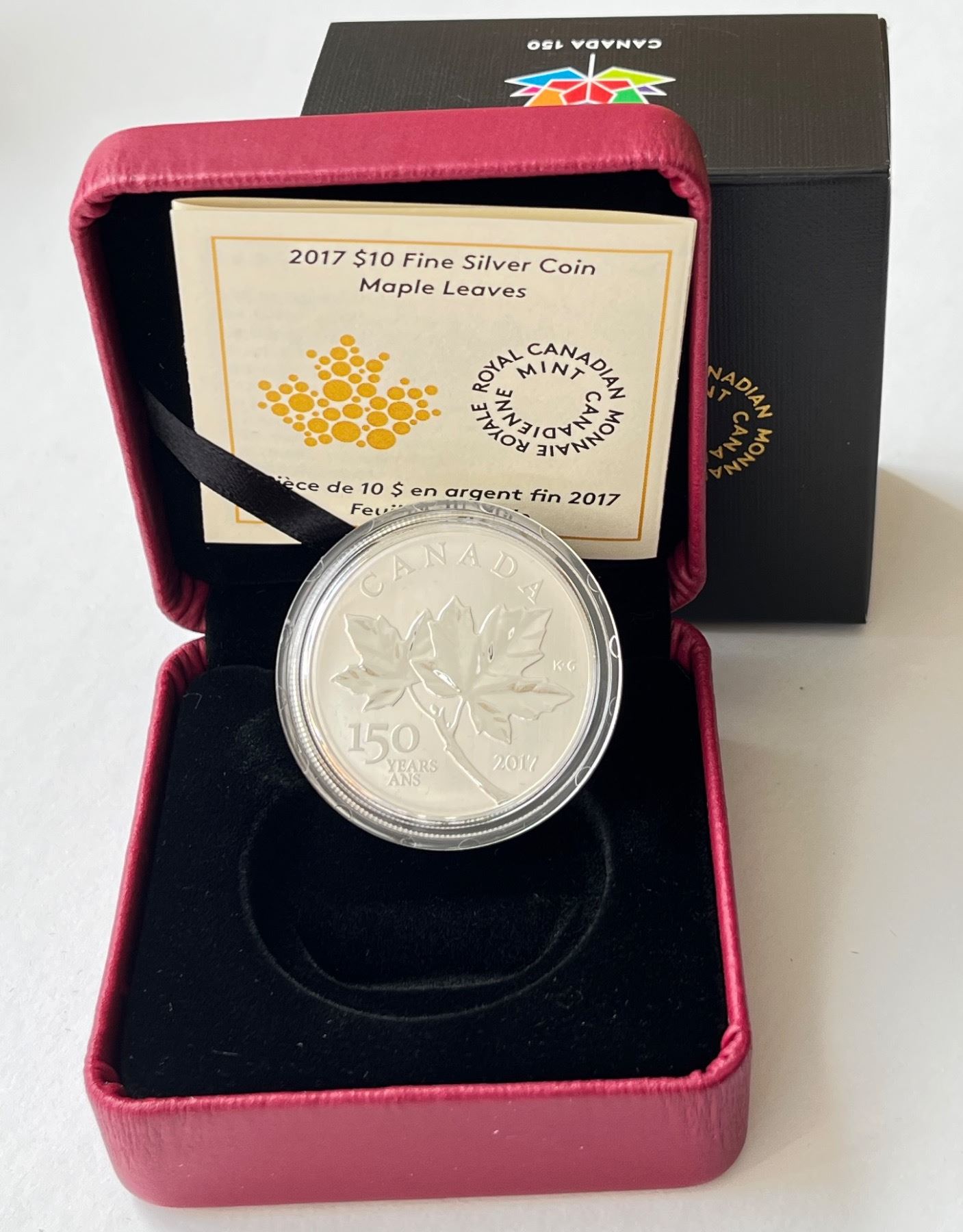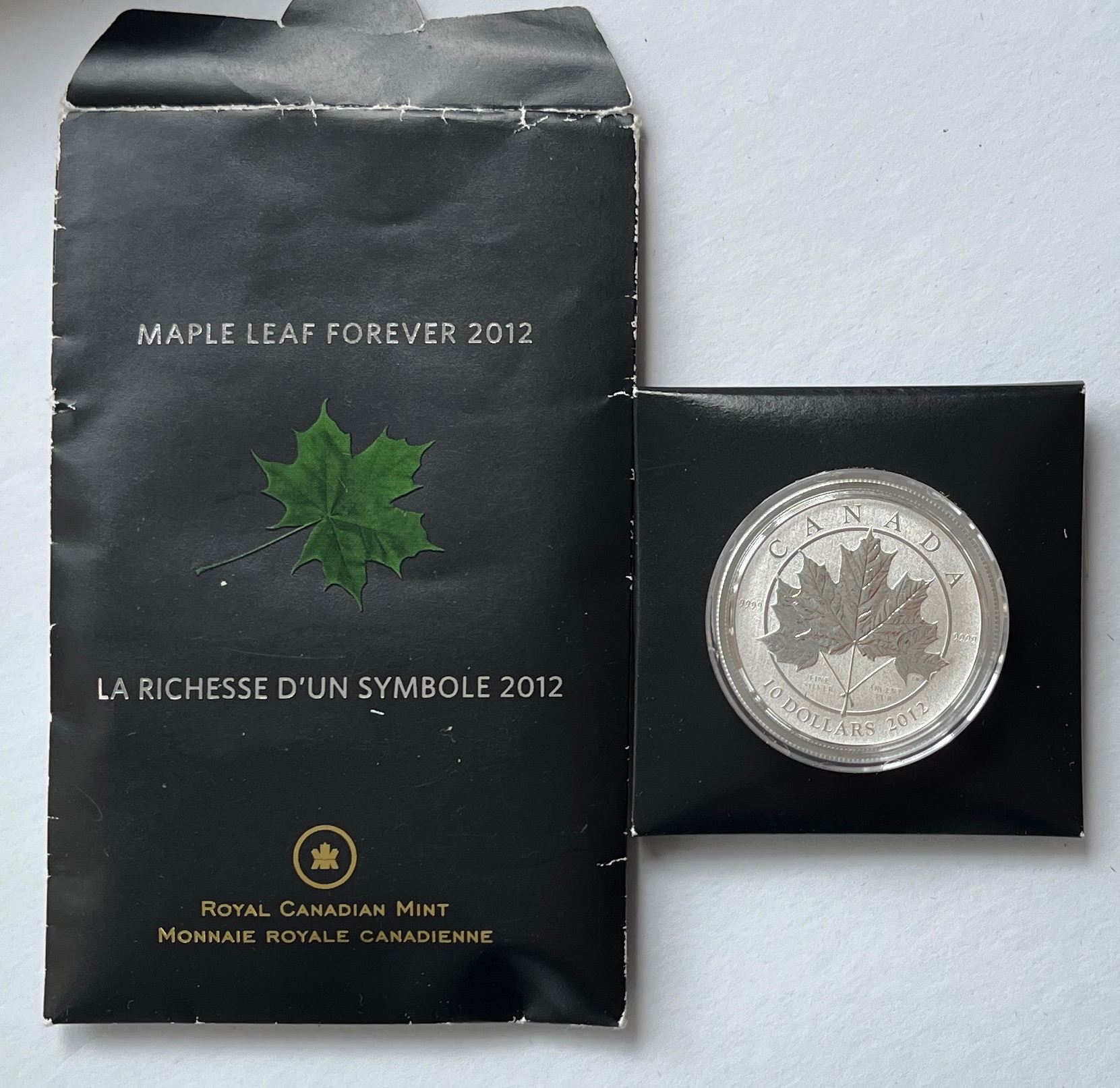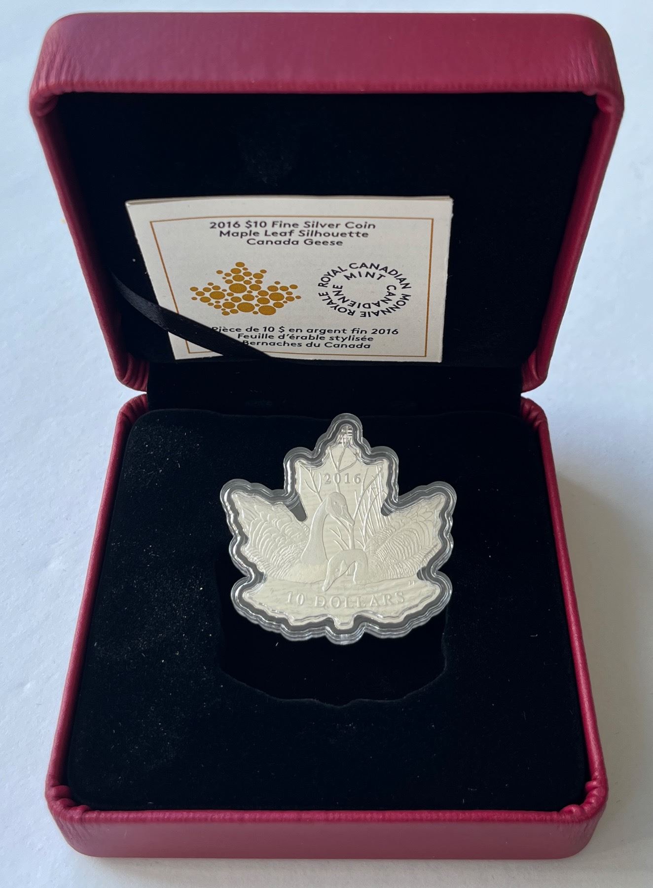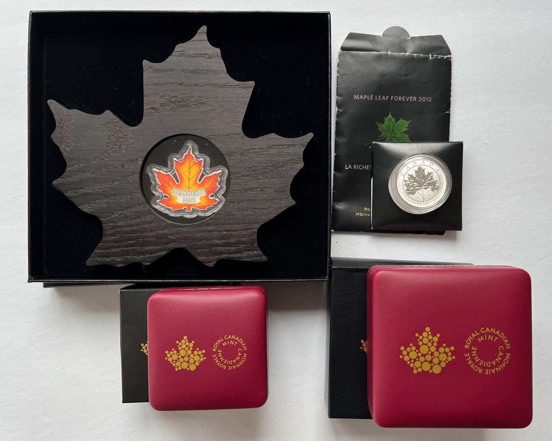 Includes: 2012 $10 Fine Silver Maple Leaf Forever. 2016 $10 Fine Silver Silhouette: Canada Geese. 2016 $20 Fine Silver Colourful Maple Leaf. 2017 $10 Fine Silver Maple Leaves. No tax. 4 pcs.