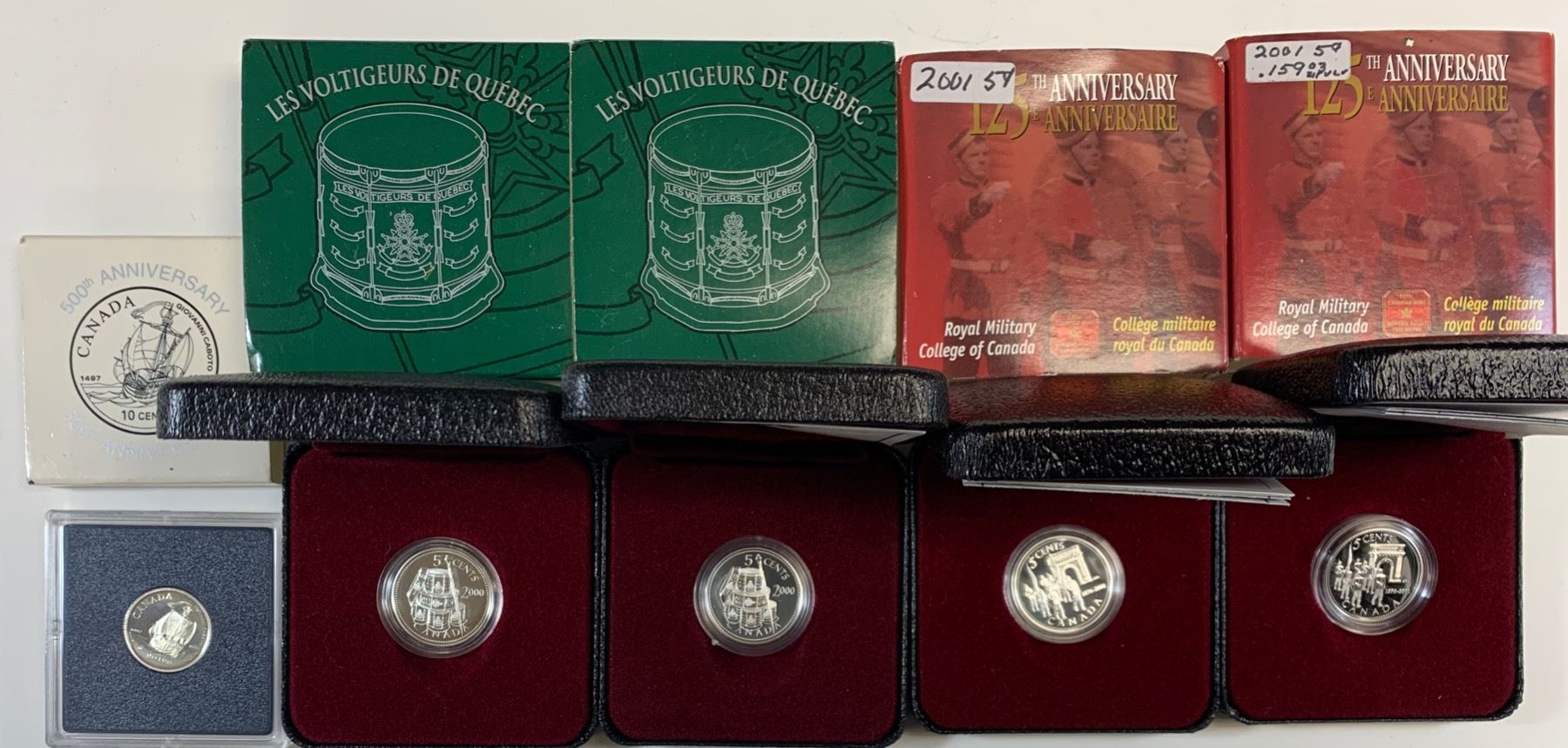 RCM lot of five silver proof 5c & 10c: two 2000 Voltigeurs 5c, two 2001 RMC Military College 5c and one 1997 silver Cabot 10c.