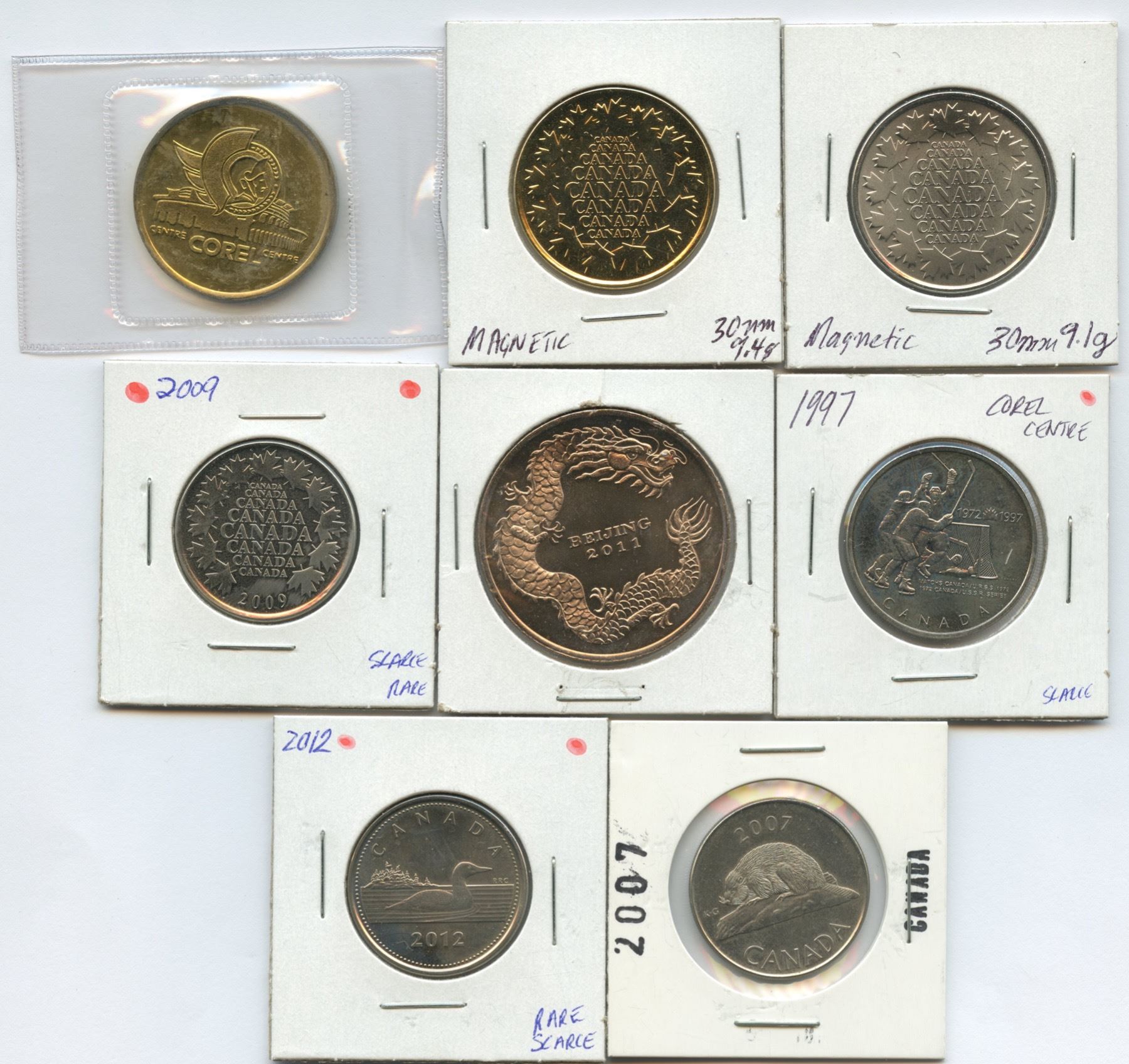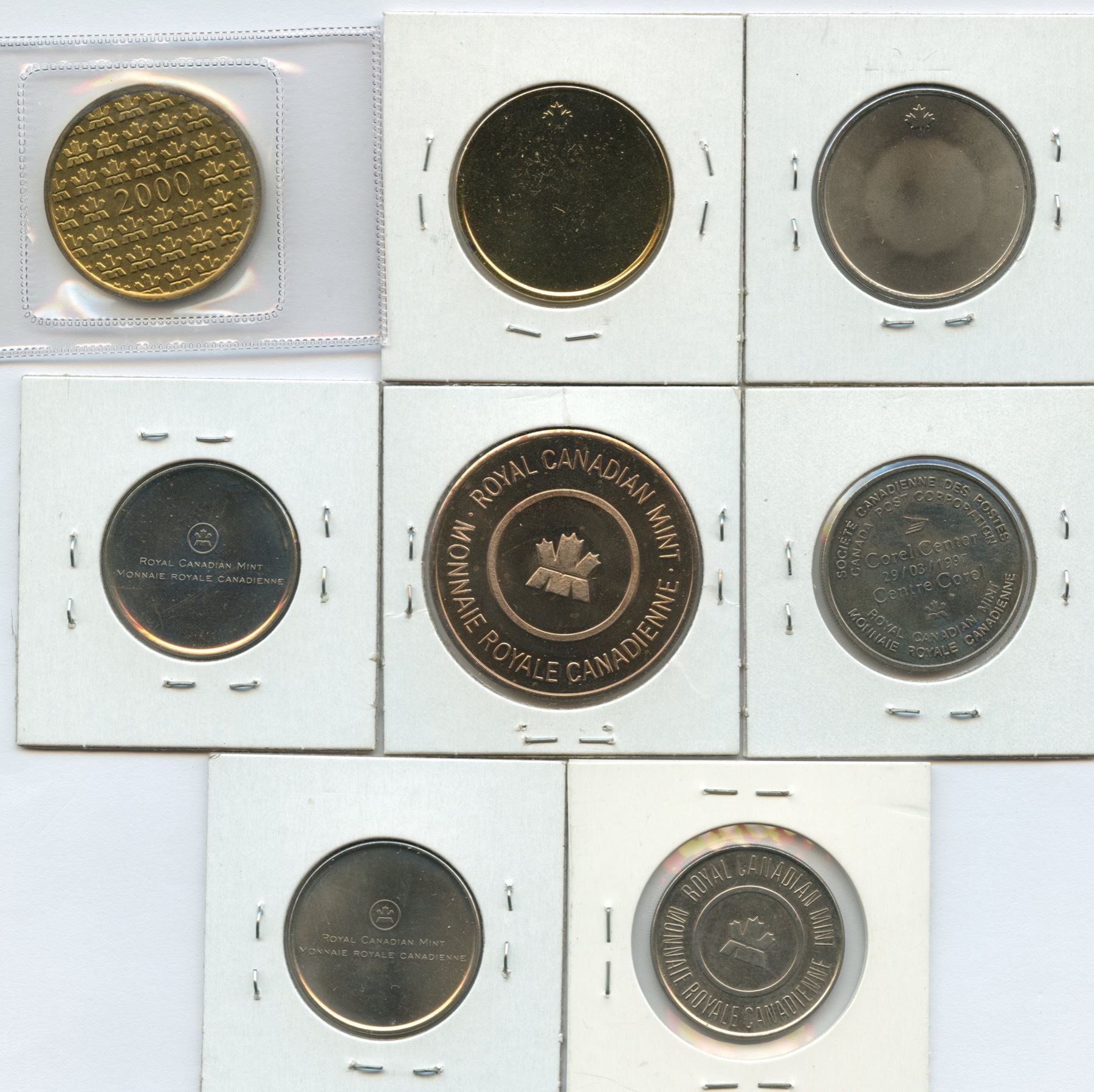 Includes: 2007 Beaver (scarce), 2009 Salesman Token (CH-SS-4 Scarce Dated Variety), 2011 Beijing/Dragon from International Coin Exposition, 2012 Loon Design (scarce), 1997 Corel Centre medallion for "1972 Canada/USSR Series", 2000 Corel Centre (sealed, given out at Ottawa Senators game). Modified Salesman tokens, Maple Leaf Reverse (Nickel and Gold-plated nickel), 30mm. 8 Pcs.
