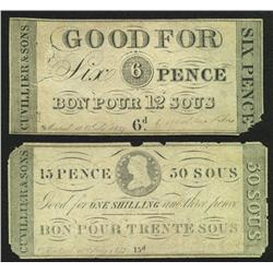 CH QC 105-10-04, 12 sous, lower right corner off, VG-F; QC 105-10-08, 15 pence, all corners off, rough top edge, VG.*