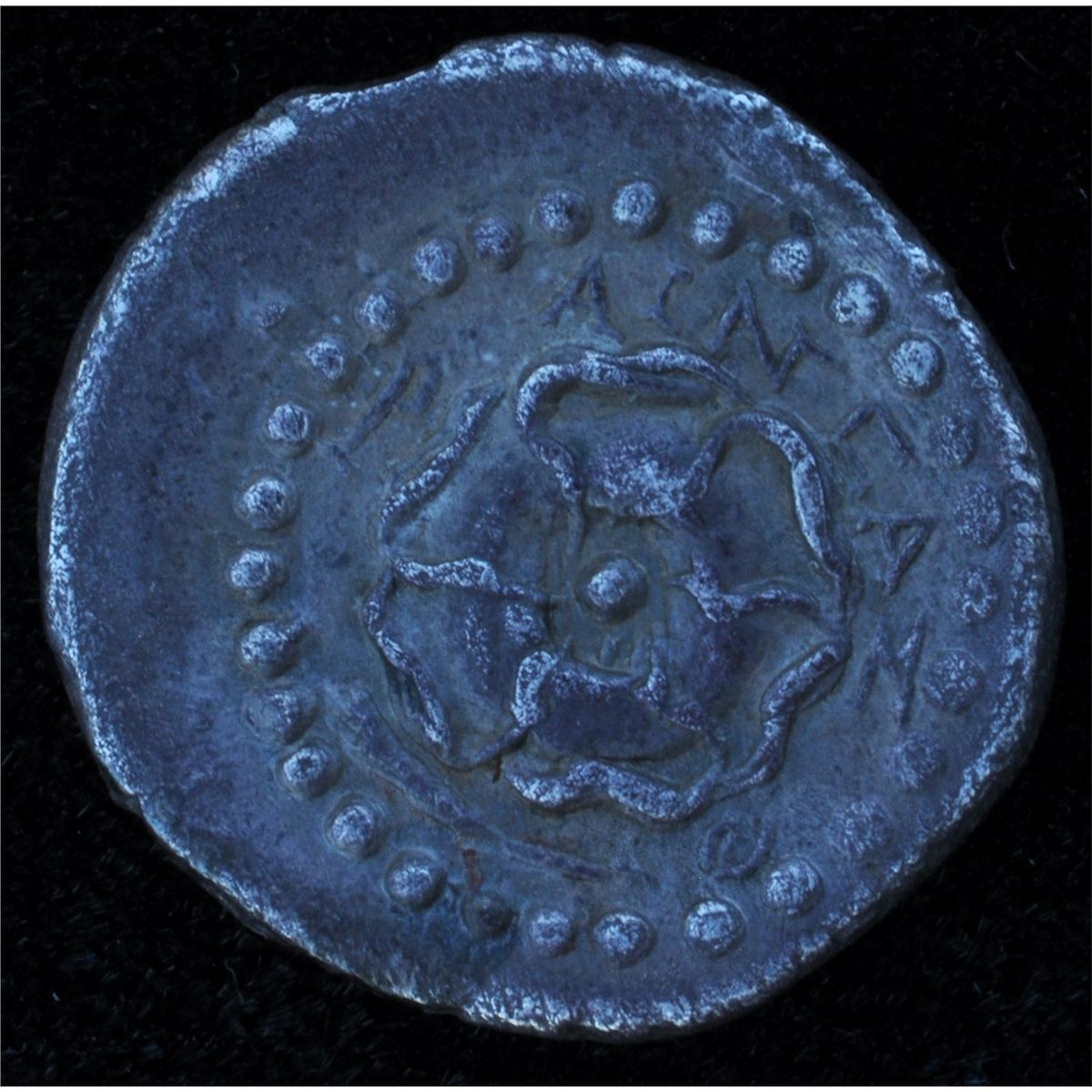 Rhodes (88-64 BC) - AR-Drachm Obv: hd. of Helios ¾ right facing Rev: Open rose w P---O on either side, corn below, with moneyer’s name AINCAZ, 3.9 grams. S-5050 Var. Toned VF.