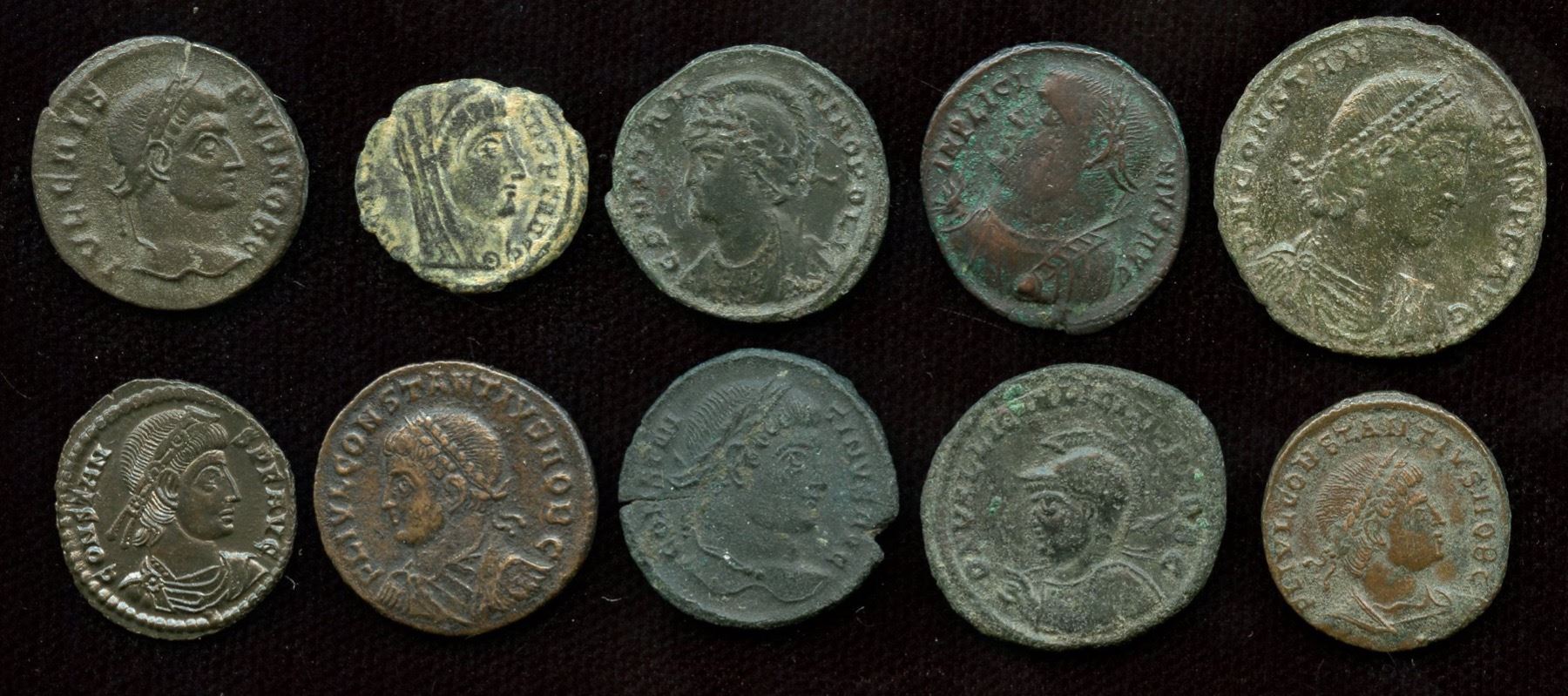 Constantine I AE3; Divus Constantine I AE4; Crispus AE3; Constantinople Commemorative (struck under Constantine I) AE3; Licinius I AE3; Licinius II AE3; Constantius II, as Caesar AE3 (x2); Constantius II Centenionalis; Constans AE3/4. Grades range from aVF - EF. 10 Pcs