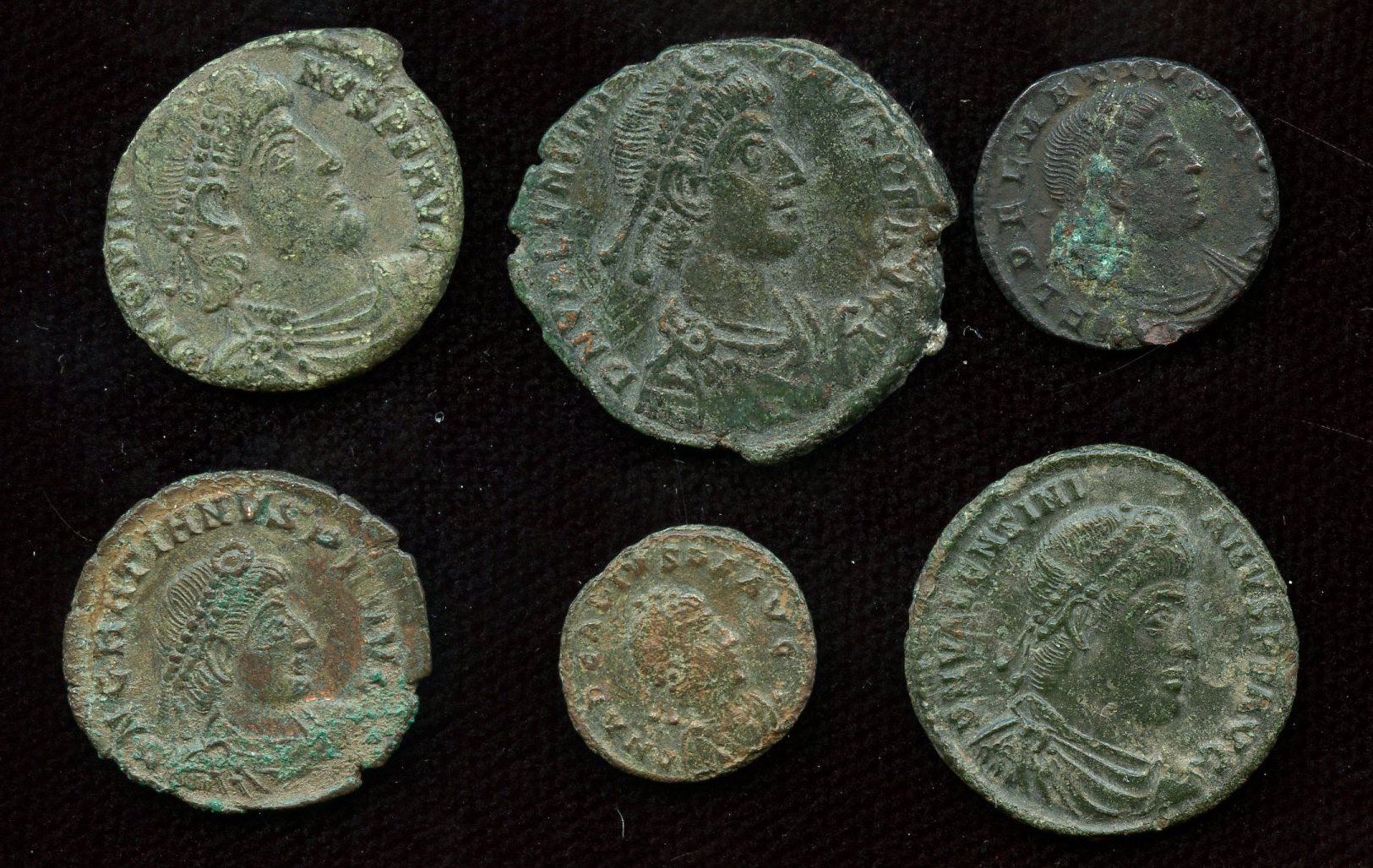Delmatius AE4 (15mm), deposit on obv; Jovian AE3 (19mm); Gratian AE3 (19mm), deposits on surfaces; Valentinian I AE3 (20mm), spots of corrosion; Valentinian II AE2 (23mm), cleaning scratches; Arcadius AE4 (13mm). Grades range from aVF - gVF. 6 Pcs