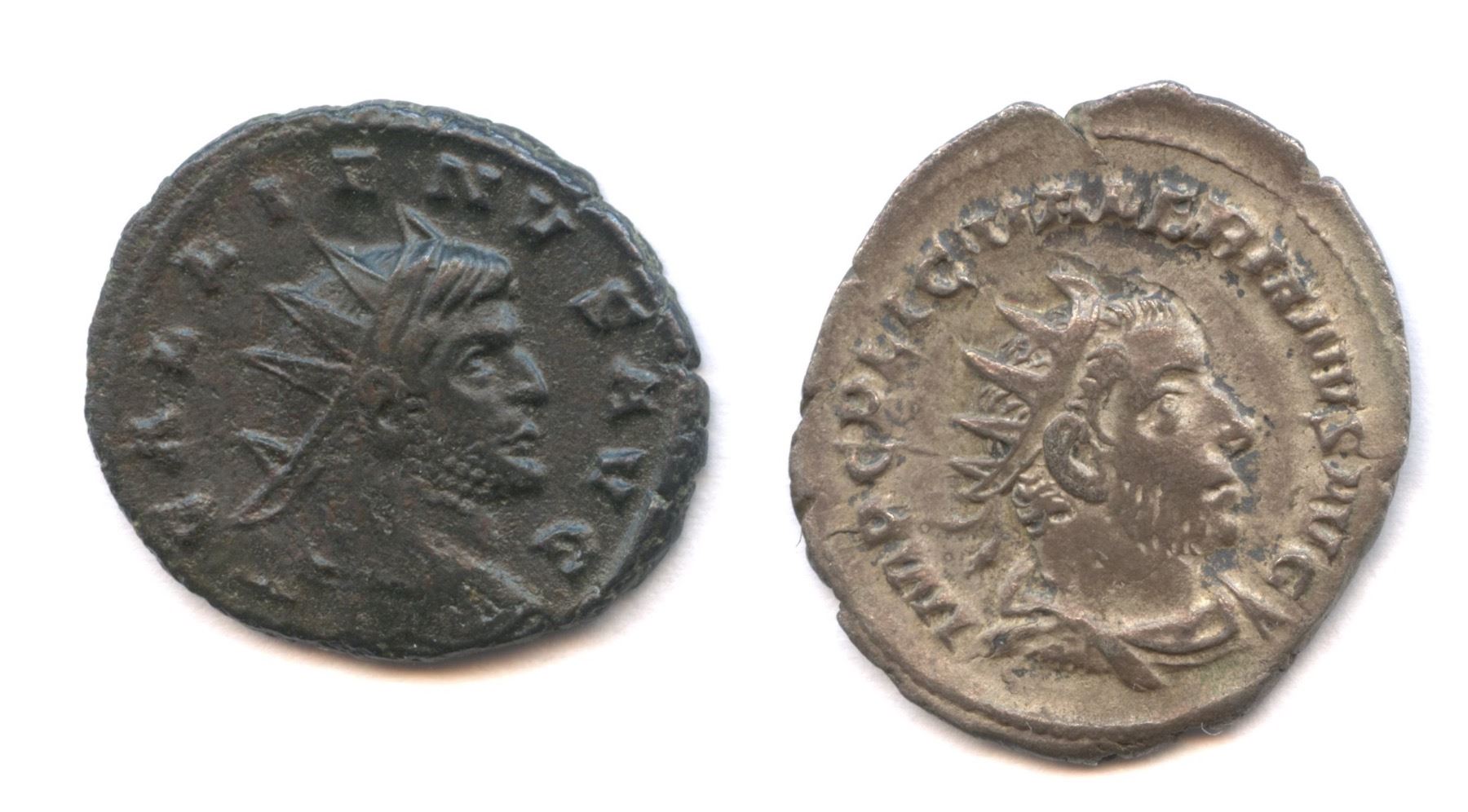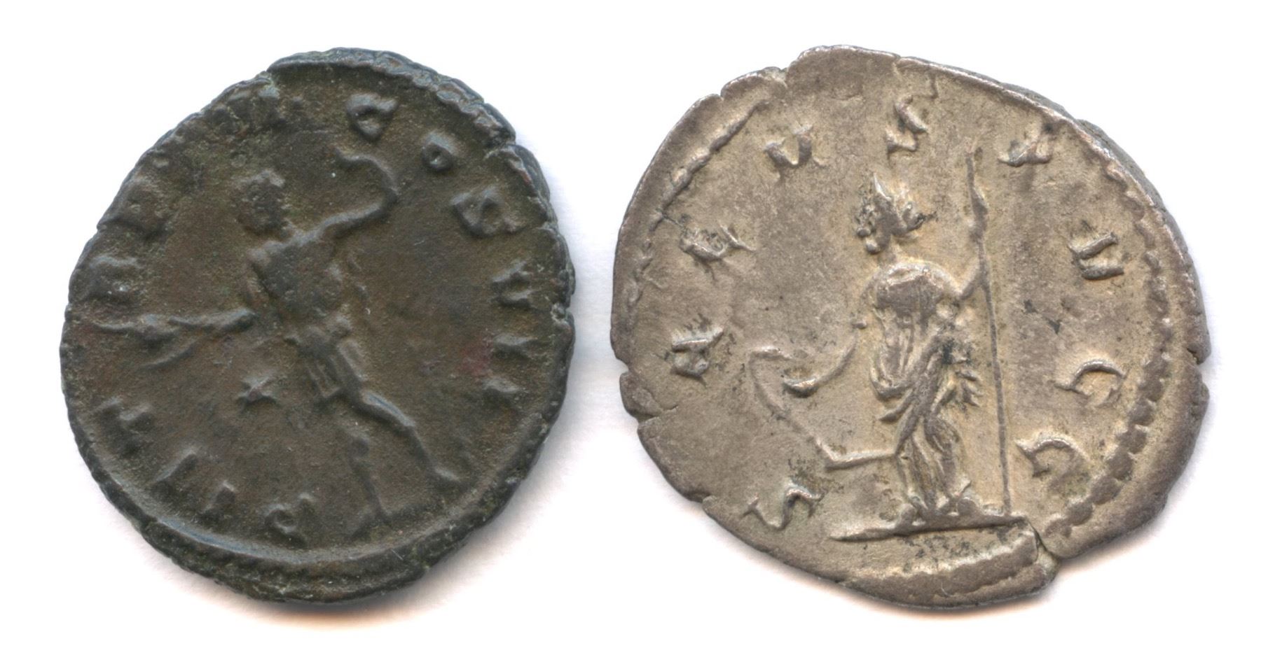 Valerian I (AD 253-260). AR Antoninianus (2.82g). Rev: Salus standing left, feeding snake on altar. Rome mint. RIC V 121; gVF || Gallienus (AD 253-68). Billon Antoninianus (3.66g). Rev: Gallienus standing left, holding globe and resting on spear. Siscia mint. RIC V 550; gVF, reverse softly struck; Ex CNG. 2 Pcs.