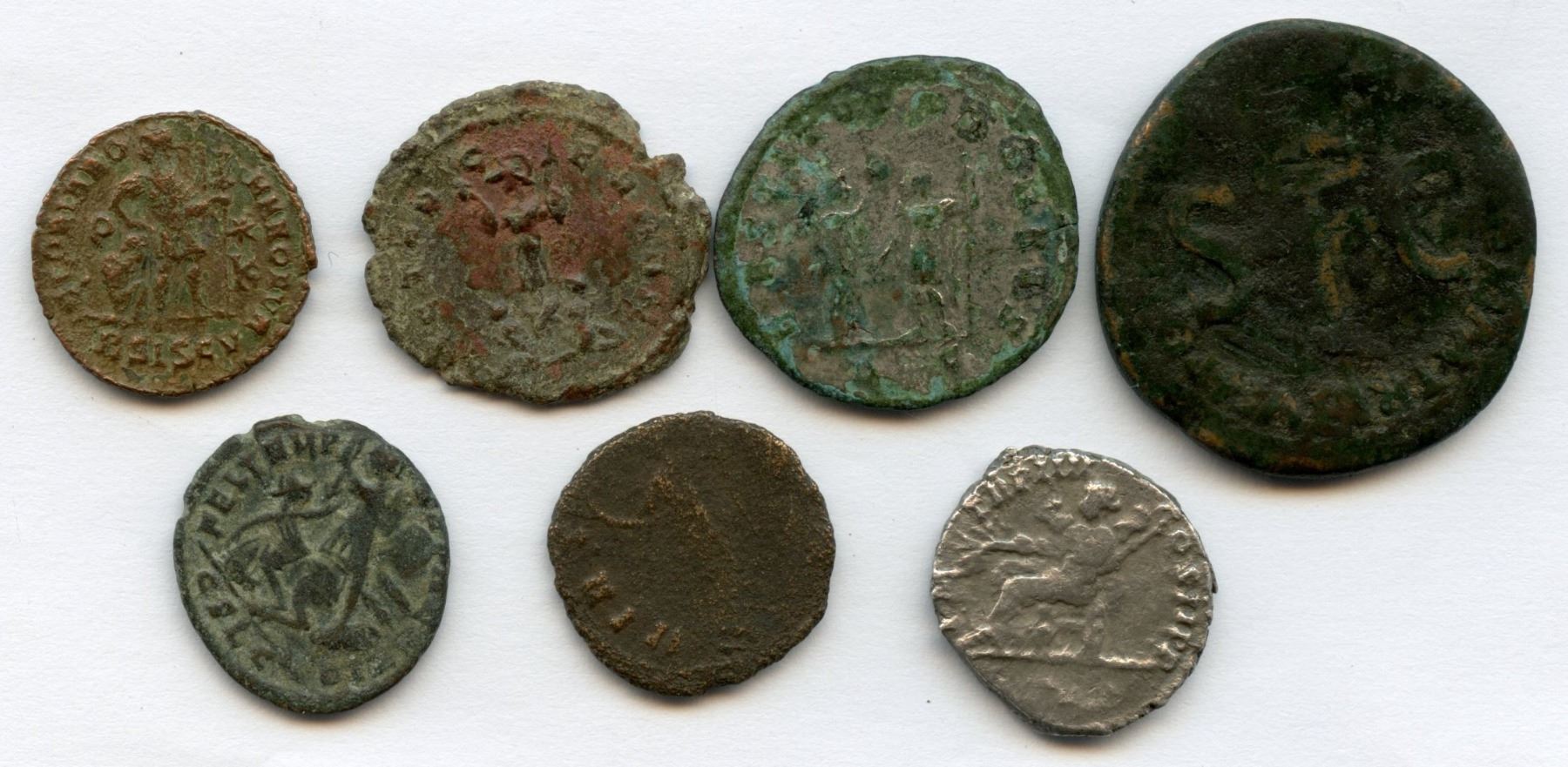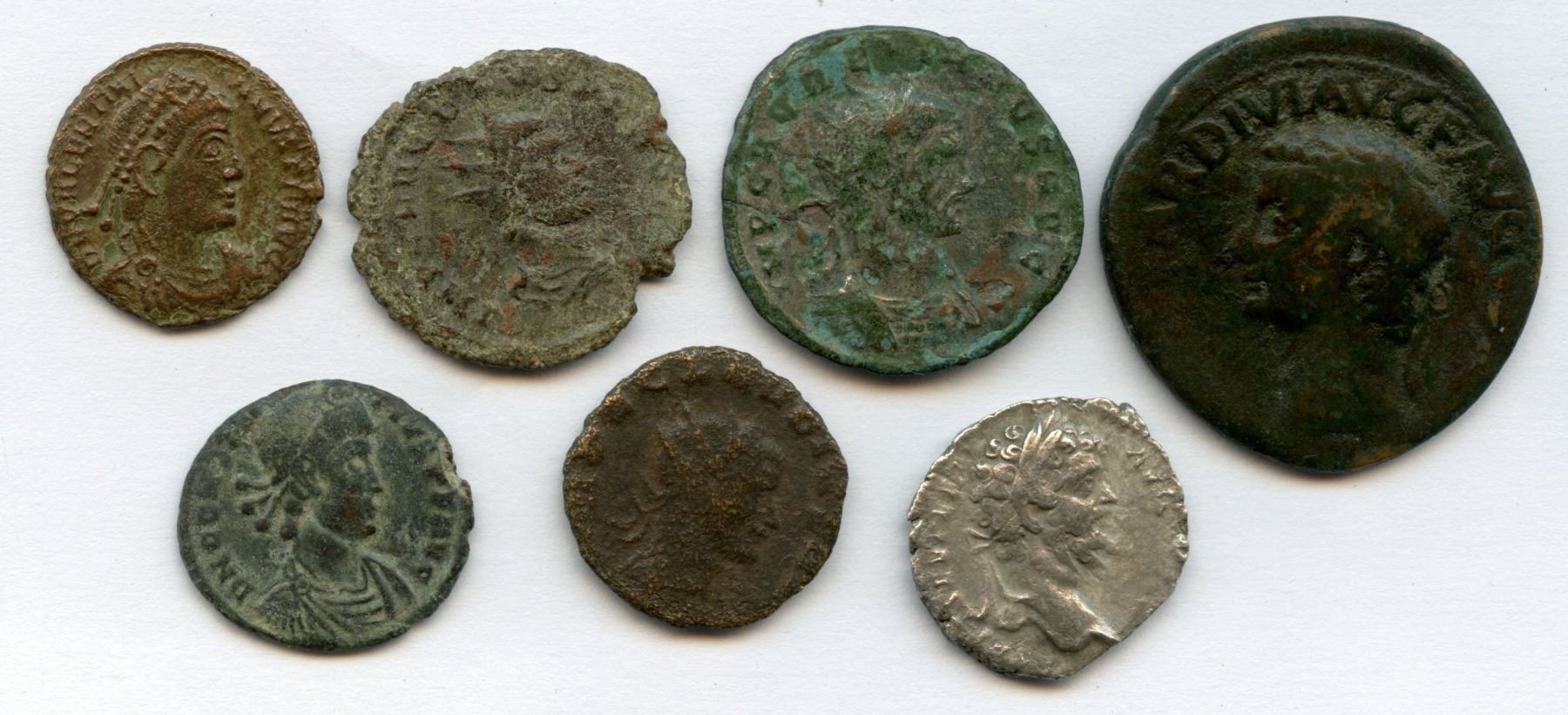 Tiberius (AD 14-27). AE As (10.2g); Fine || Septimius Severus (AD 193-211). AR Denarius (3.2g); VF/about VF || Claudius II Gothicus (AD 268-270). Billon Antoninianus (1.9g); good Fine/about Fine || Claudius II Gothicus (AD 268-270). Billon Antoninianus (2.8g); good Fine, ragged flan || Aurelian (AD 270-275). Billon Antoninianus (2.1g); good Fine, corrosion on obv || Constantius II (AD 337-361). AE3 (2.1g); about VF || Valentinian I (AD 364-375). AE3 (2.3g); VF/about VF, roughness. 7 Pcs.