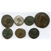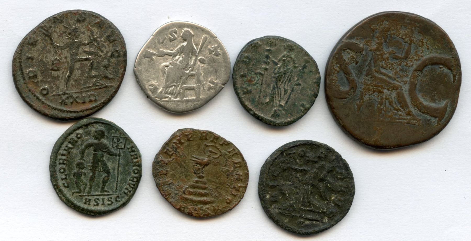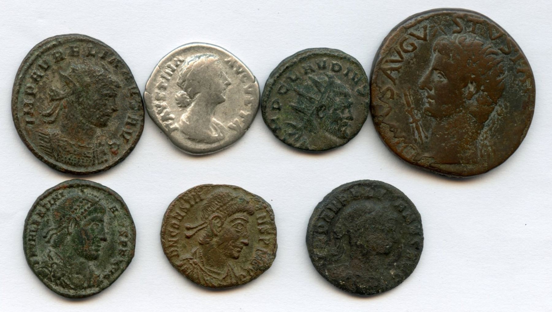 Divus Augustus. Struck under Tiberius (AD 14-37). AE As (10.4g); good Fine/Fine, spots of corrosion || Faustina Senior, wife of Antoninius Pius. AR Denarius (3.2g). Mint: Rome; good Fine || Claudius II Gothicus (AD 268-270). Billon Antoninianus (2.2g); VF || Aurelian (AD 270-275). AE Denarius (2.3g); Fine, corrosion on both sides || Aurelian (AD 270-275). Billon Antoninianus (4.0g); about VF, obv roughness || Constans (AD 337-350). AE3 (2.0g); about VF, some roughness || Valentinian I (AD 364-375). AE3 (2.5g); about VF, spots of corrosion on obv. 7 Pcs.