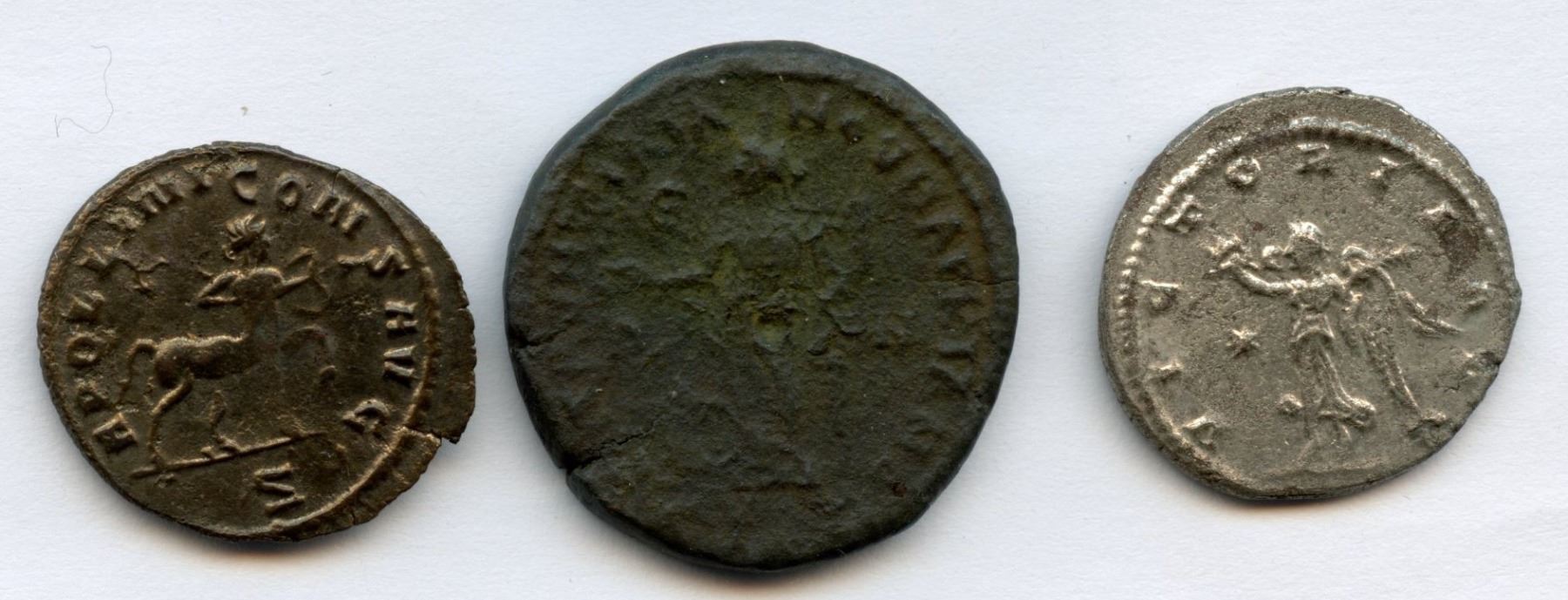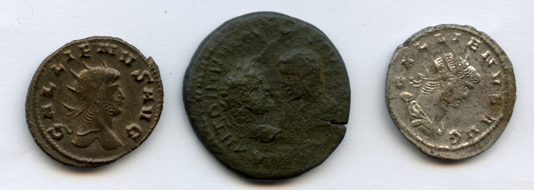 Gallienus (AD 253-268) Silvered Billon Antoninianus (3.9g). Rev: Victory standing left. Mint: Antioch; good VF, spot of encrustation on obv || Gallienus (AD 253-268) Billon Antoninianus (3.1g). Rev: Centaur walking right, drawing bow, retrograde Z in exergue. Mint: Rome; good VF, coin center is flatly struck || MOESIA INFERIOR, Marcianopolis. Caracalla (AD 198-217) & Julia Domna. AE Pentassarion (11.9g). Rev: Tyche standing left, holding rudder and cornucopia. good Fine, rough surfaces. 3 Pcs.