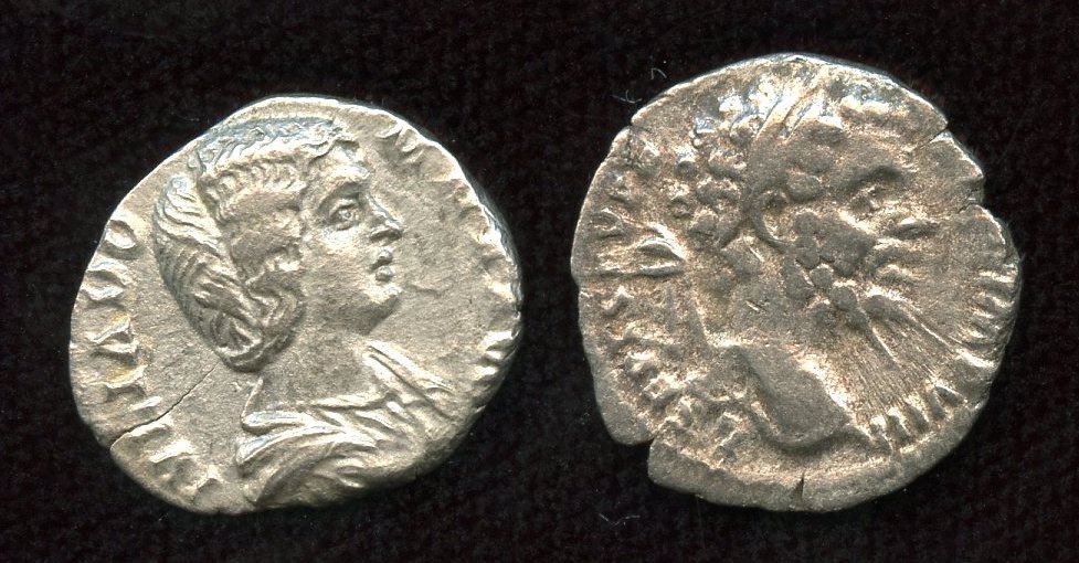 Severus (18mm, 2.40g) Rev: Victory holding wreath and trophy. RIC 76; aVF/VF || Julia (18mm, 2.20g) Rev: Vesta enthroned, holding palladium and sceptre. RIC 538; VF, flan crack. 2 Pcs.