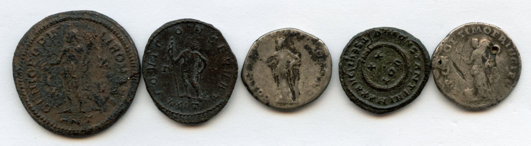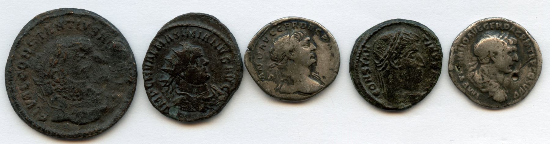 Trajan (AD 98-117). AR Denarius (2.85g). Rev: Felicitas standing left, holding olive branch and resting on column. RIC 126; about VF / Fine, scratches on rev || Trajan (AD 98-117). AR Denarius (2.80g). Rev: Genius standing left, holding patera and cornucopiae, altar at feet. RIC 184; about VF / good Fine, holed || Constantius I, as Caesar - father of Constantine the Great (AD 293-305). Æ Follis (8.68g). Rev: Genius standing left, holding patera and cornucopia. RIC 55a (Antioch); gVF, corroded surfaces || Constantine I, the Great (AD 310-337) Æ Follis (3.24g). Rev: Inscription of VOT / • / X X within wreath. RIC 123 (Thessalonica); VF, rough surfaces || Maximianus (286-305). Billon Antoninianus (3.82g). Rev: Jupiter standing, holding scepter in right hand, thunderbolt in left at hip. RIC 563; VF. 5 Pcs.