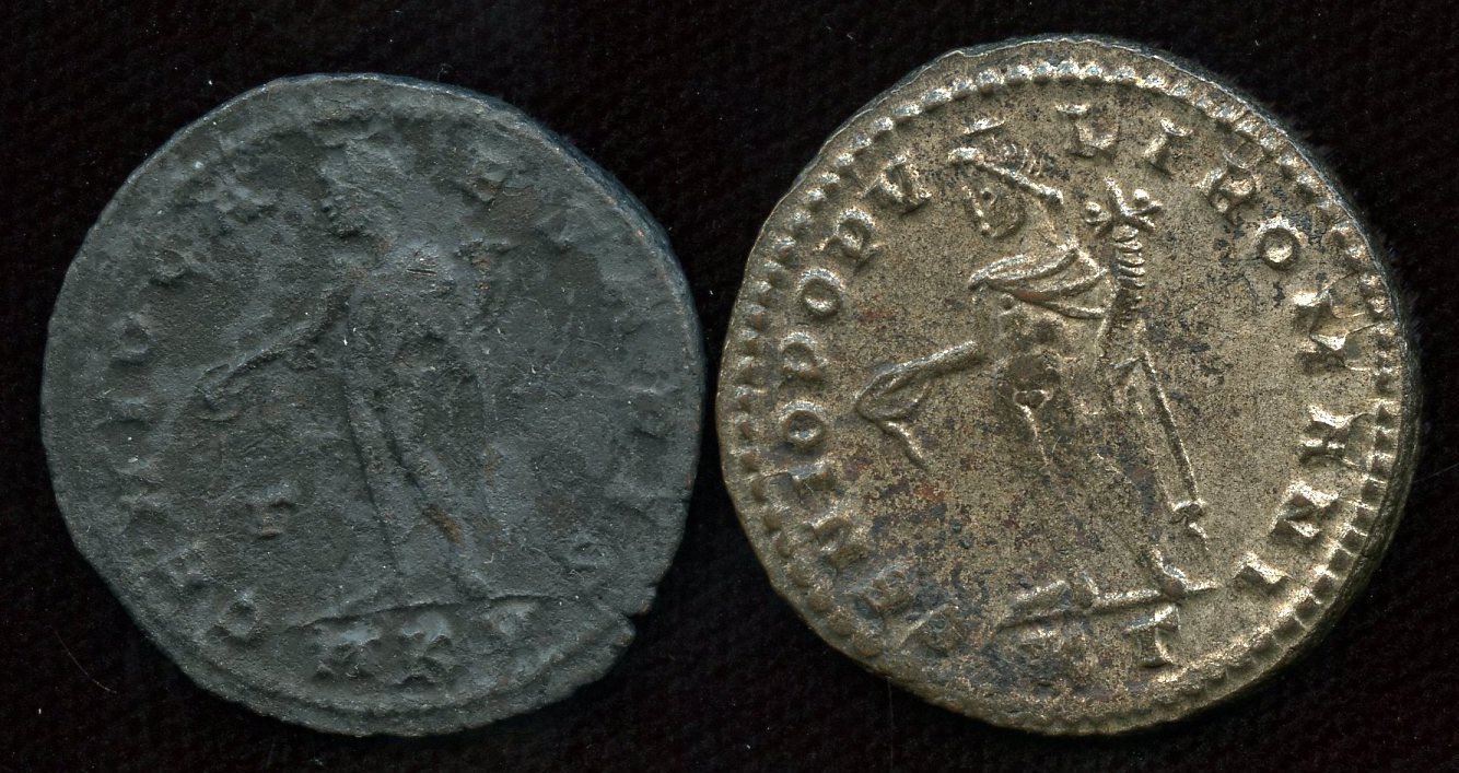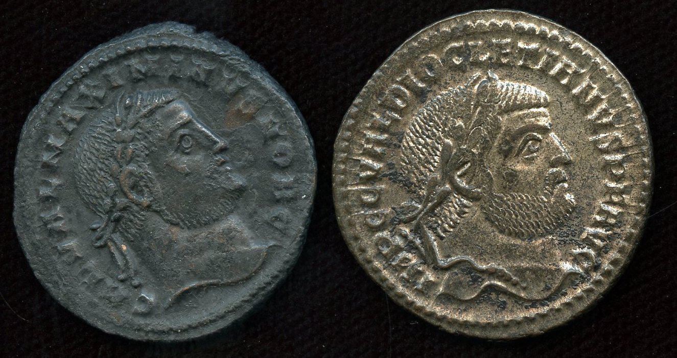 Maximinus II, as Caesar (6.03g) Rev: Genius stg. l. Cyzicus mint. RIC 43; aEF, rough surface on rev || Diocletian (8.29g) Rev: Genius stg. l. Heraclea mint. RIC 12a; gVF, silvered, deposits on obv. 2 Pcs