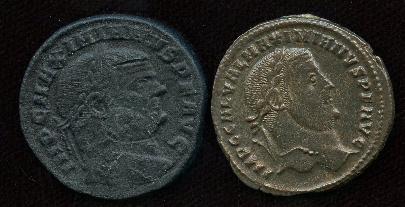 Maximianus (9.20g) Rev: Moneta stg. l. Rome mint. RIC 111b; gVF, rough surfaces || Galerius, as Augustus (9.27g) Rev: Genius stg. l. Cyzicus mint. RIC 27a; aEF. 2 Pcs