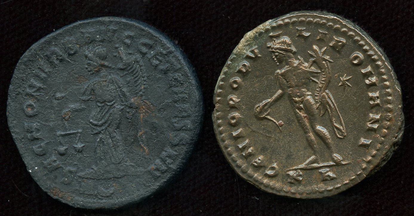 Maximianus (9.20g) Rev: Moneta stg. l. Rome mint. RIC 111b; gVF, rough surfaces || Galerius, as Augustus (9.27g) Rev: Genius stg. l. Cyzicus mint. RIC 27a; aEF. 2 Pcs