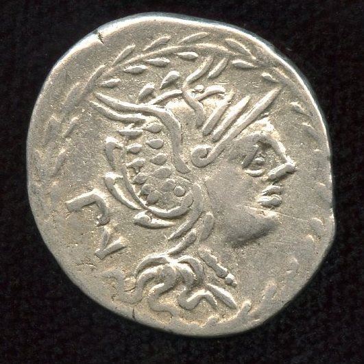 (21mm, 3.95g) Head of Roma r. in horned, winged helmet, all within wreath. Rev: Victory driving biga r., holding whip. Crawford 324/1; aVF.