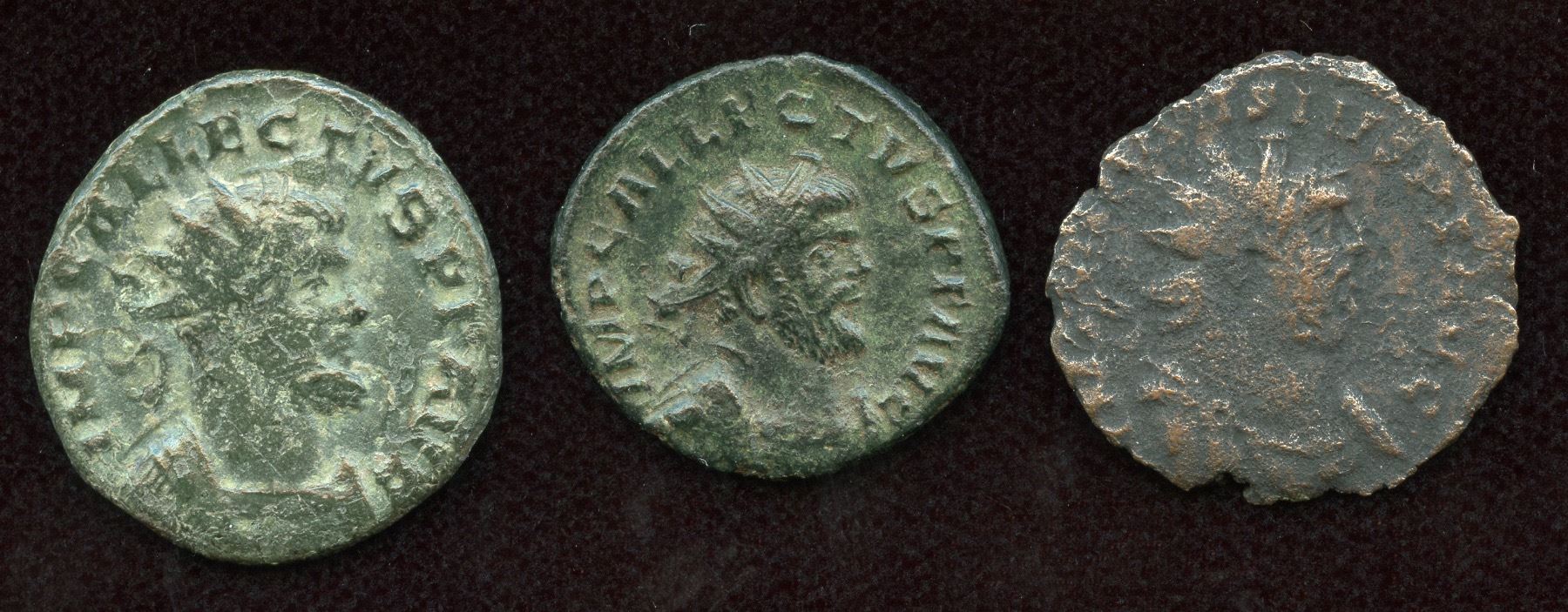 Carausius. Billon Antoninianus. Rev: Pax stg. l. RIC 101; aVF, ragged flan, pitting || Allectus. Billon Antoninianus. Rev: Pax stg. l. RIC 28; gF, flaked patina || Allectus. AE Quinarius. Rev: Galley r., no mast, with waves. London Mint; VF. 3 Pcs.