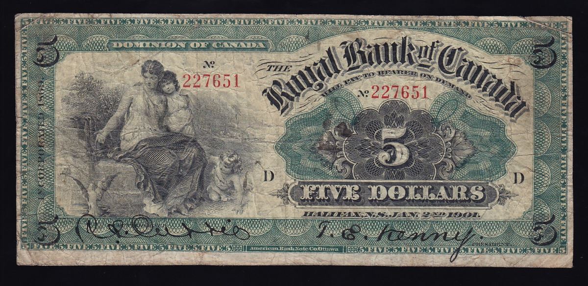 CH 630-10-02-04. Fine, faces up very well, back is dirty. Only 10 notes on the registry. Large seated allegorical female with two children. S/N:227651/D. We sold a lower quality example in our Spring 2012 Expo - lot #985 that realized $3300