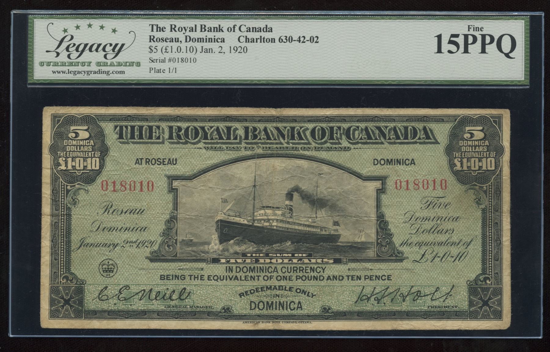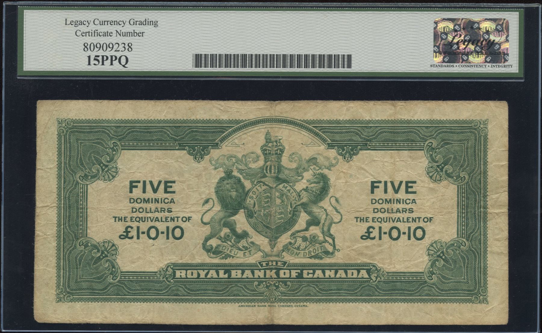 CH-630-42-02, Neil Holt, West Indies, DOMINICA, Legacy Fine 15 PPQ. 1 of 5 known with the Neil-Holt variety. A highly under rated note. S/N:018010.