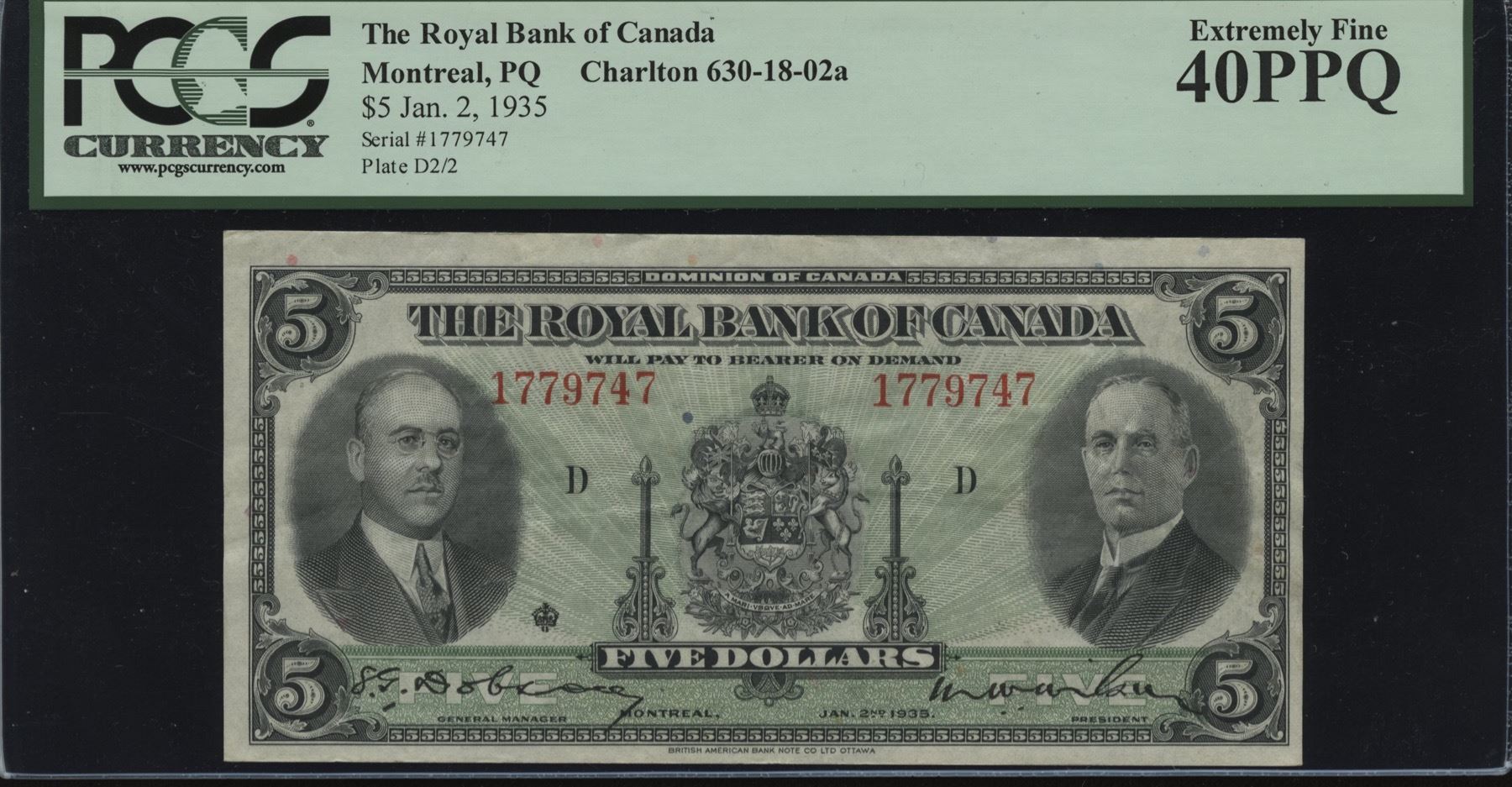 CH 630-18-02a. PCGS EF40PPQ. S/N: 1779747/D.