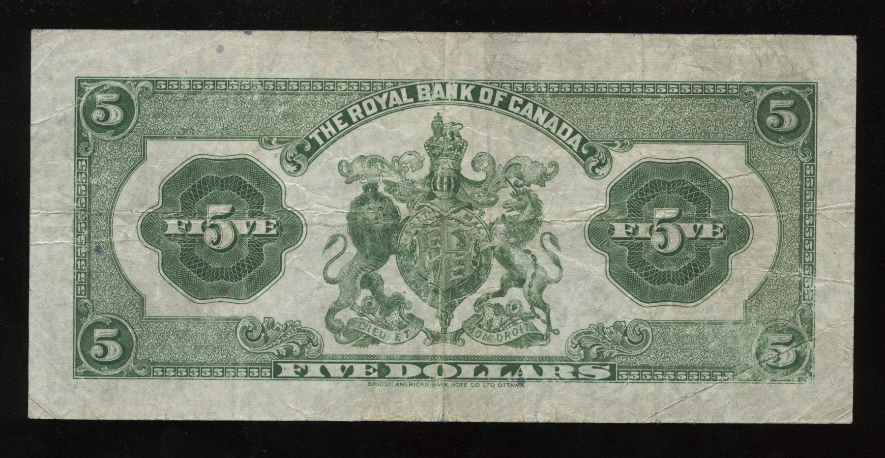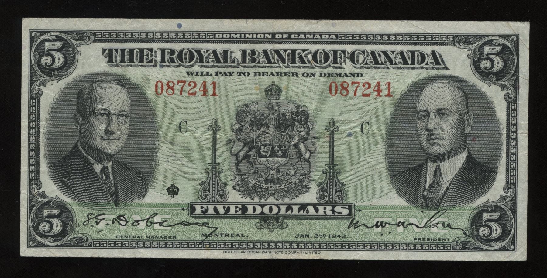 CH 630-20-02. This is one of the notes that bears the date 1943, the last domestic issue of any chartered bank in Canada. Very Fine. S/N:087241/C.
