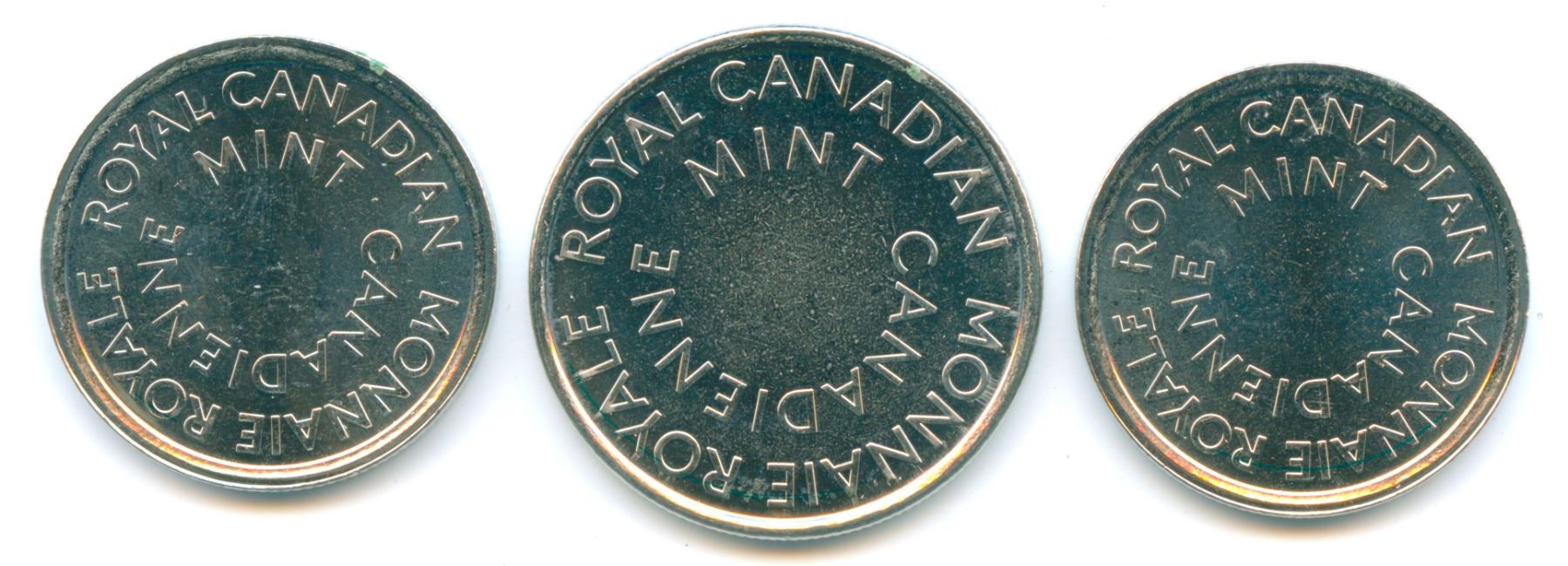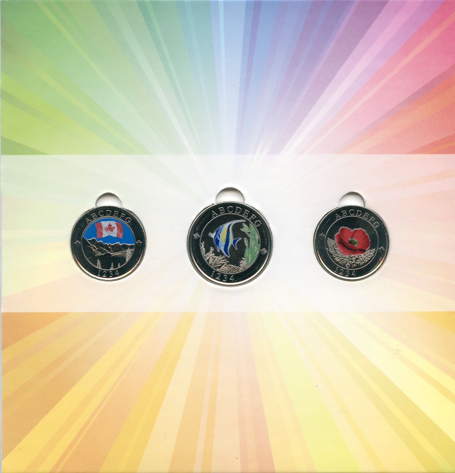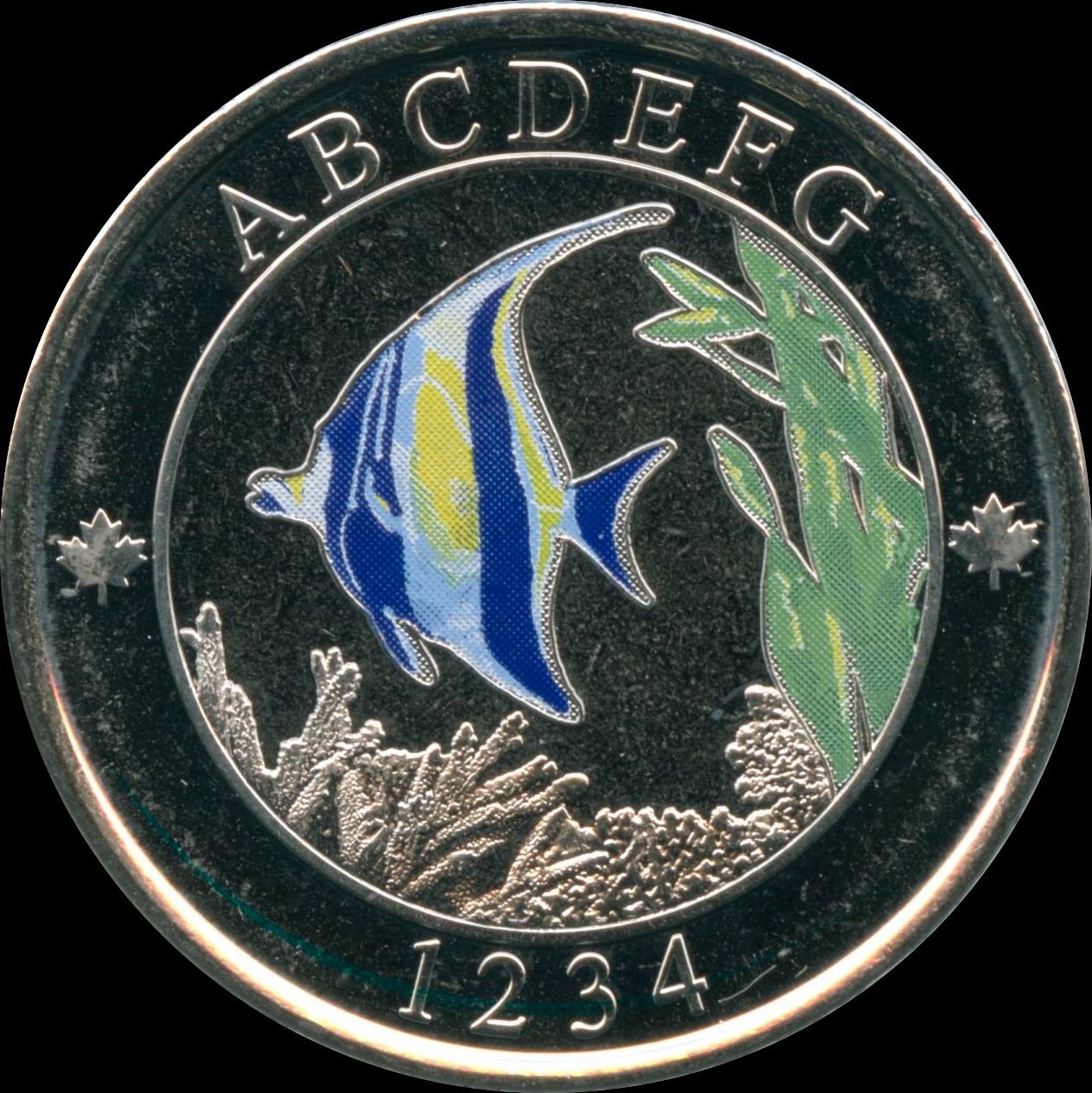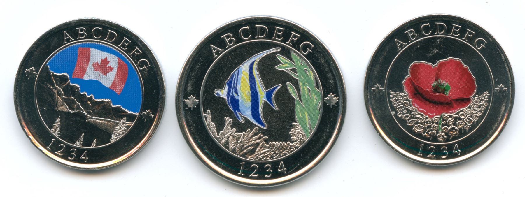 Three Test Tokens from the 2015 Currency Conference held in Vancouver, BC. Canada Flag, Poppy Token and Fish ABCDEFG 1234, multiple nickel plated steel, magnetic. 24mm, 2mm thick, reeded edge, 6gms; Fish Token, ABCDEFG 1234, multiple nickel plated steel, magnetic, 27mm, 1.9mm thick, reeded edge, 7gms. For the interesting story on these test tokens refer to the inside front page of our 2018 Fall Expo catalogue. Housed in original RCM Folder. 3 Pcs.