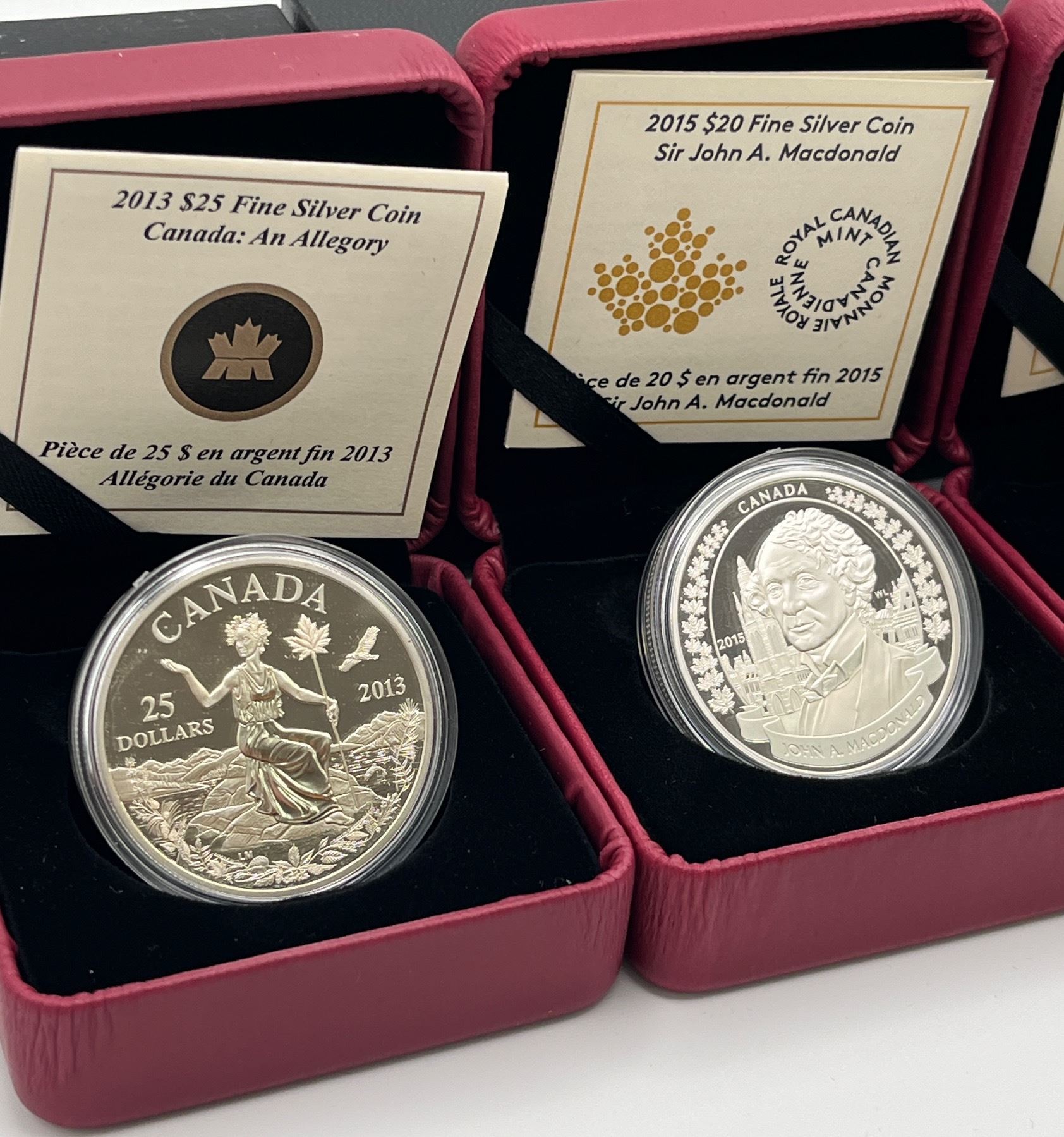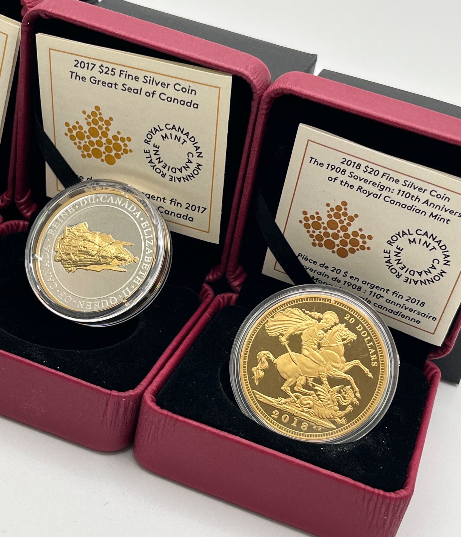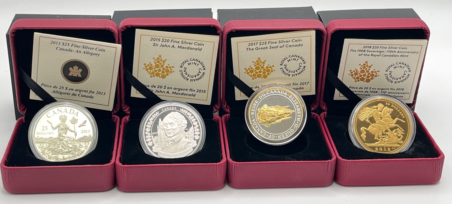 Includes: 2013 $25 Canada Allegory, 2015 $20 Sir John A. MacDonald, 2017 $25 Great Seal of Canada, 2018 $20 110th Anniversary of the 1908 Sovereign. 4 pcs.