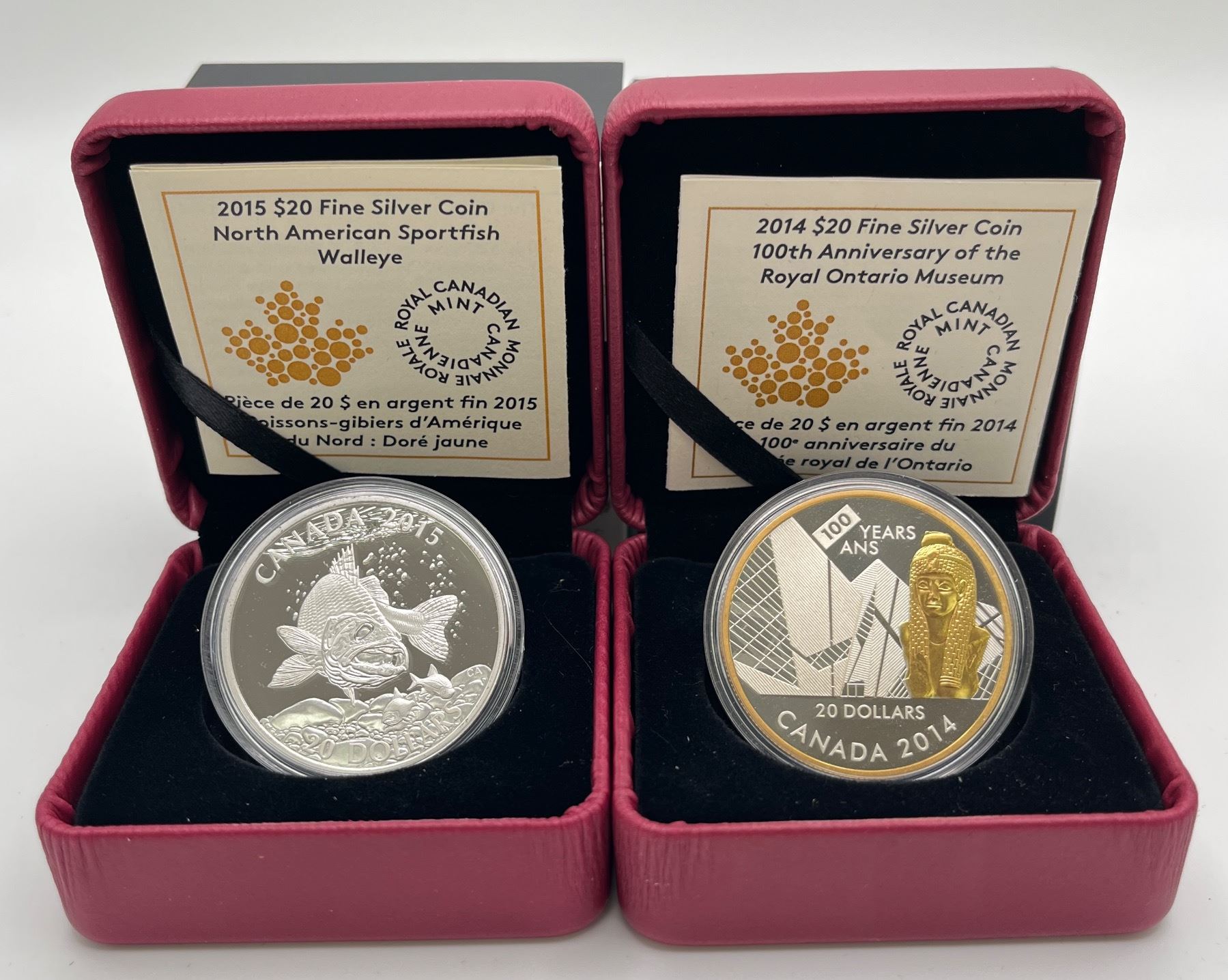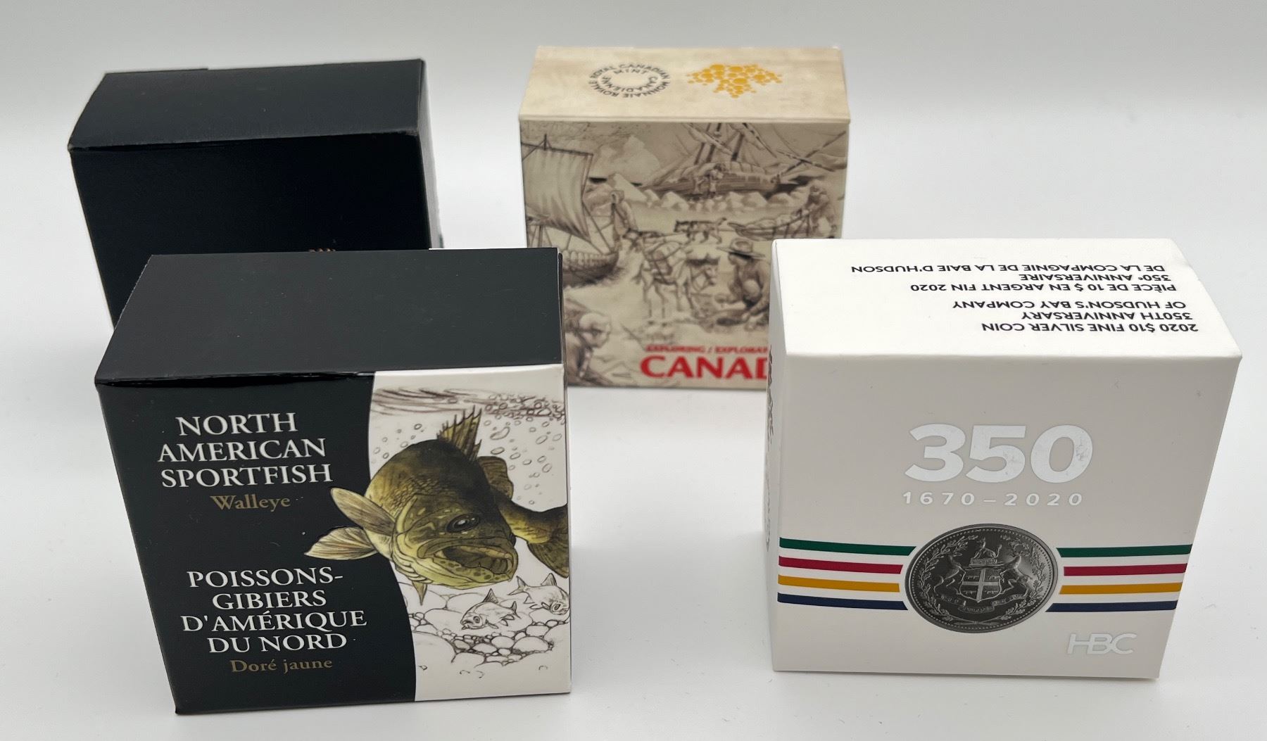 Includes: 2014 Exploration Series $15 Voyageur, 2015 North American Sportfish - Walleye, 2015 100th Anniversary of the Royal Ontario Museum, 2020 $10 350th Anniversary of Hudson's Bay Company. 4 pcs.