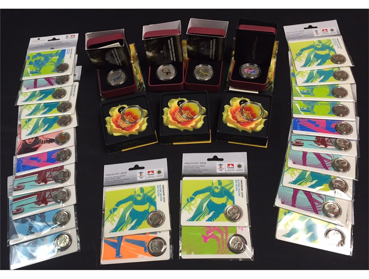 Royal Canadian Mint Lot Includes: 3X2013 Magnified Beauty: The Eastern Prickly Pear Cactus, 2013 Purple Cornflower and Eastern Tailed Blue 25-cent Coloured Coins. 3X Dinosaur Glow-in-the-Dark Coins. 25 X Petro-Canada Coloured Twenty Five Cents. 32 Pcs.
