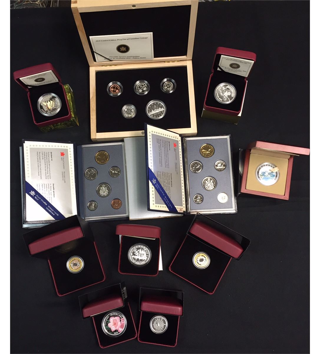 Royal Canadian Mint Lot Includes: 2010 Limited Edition Proof Set, 1992 & 1993 Specimen Sets, 2003 Rocky Mountains $20, 2X2009 Return of the Tyee $3, 2012 Rhododendron $20, 2013 Bank Note $5, 2013 Butterflies of Canada $20, 2014 Spider and Web $3, 2014 O Canada Moose $10 Silver. 11 Pcs.