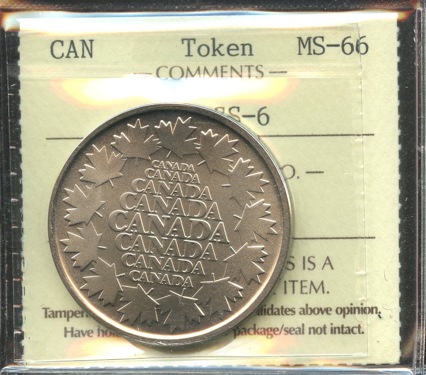 Salesman Sample CH SS-6 Round, Canada/Maple Leaves. Multi-ply nickel-plated steel, silver colour, magnetic, plain edge. 35.0mm diameter, 2.1mm thickness, 12.60gms. ICCS MS-66.