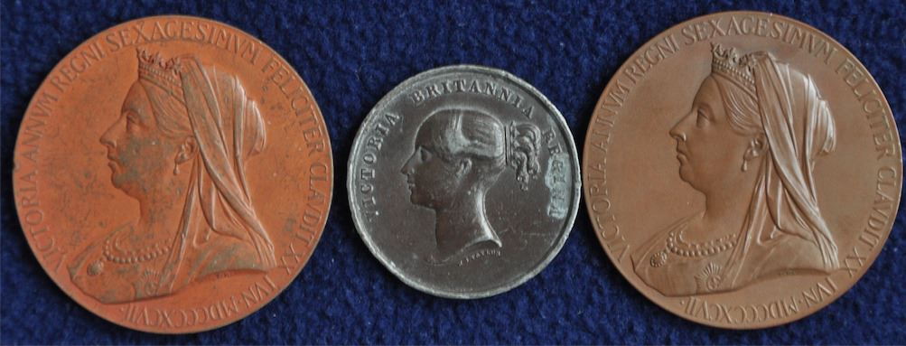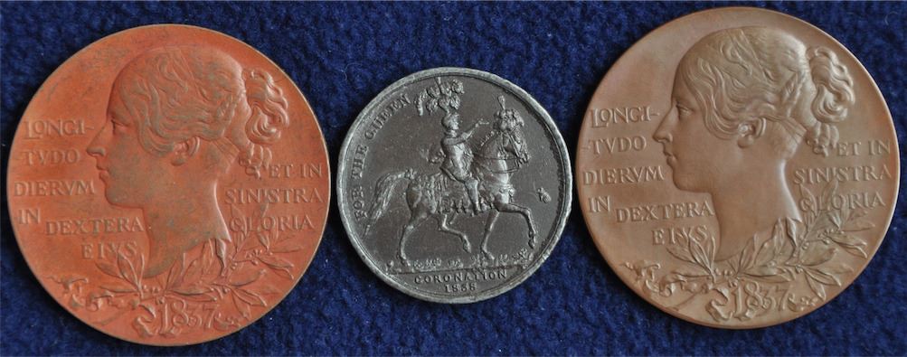 42mm, Copper. Victoria Coronation, 1838. Obv. Young Victoria bust; Rev. Equestrian figure of a knight, damage on obv. At 3 pm, Eimer 1314, BHM 1838; 55mm, Victoria 1897 diamond jubilee. Obv. Crowned, veiled and draped Victoria; Rev. young head of Victoria, Eimer 1817, BHM 3506, (2 specimens), AE, 3 Pcs.