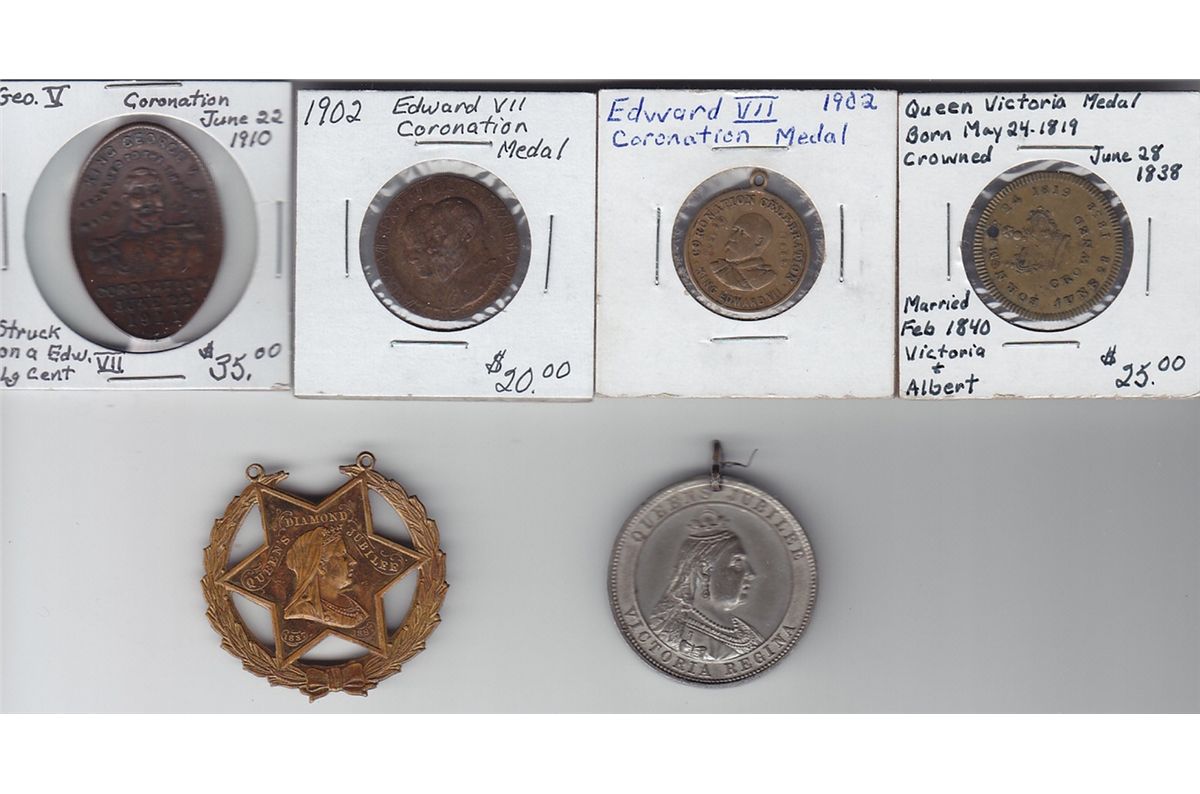 Leroux 1874; 1887 Ellis Victoria jubilee piece; Victoria and Albert married 1840 bronze; 1902 Edward VII coronation, bronze; 1902 Edward VII and Queen Alexandra, copper; elongated Canadian large cent 1910 coronation of George V. 6 Pcs.
