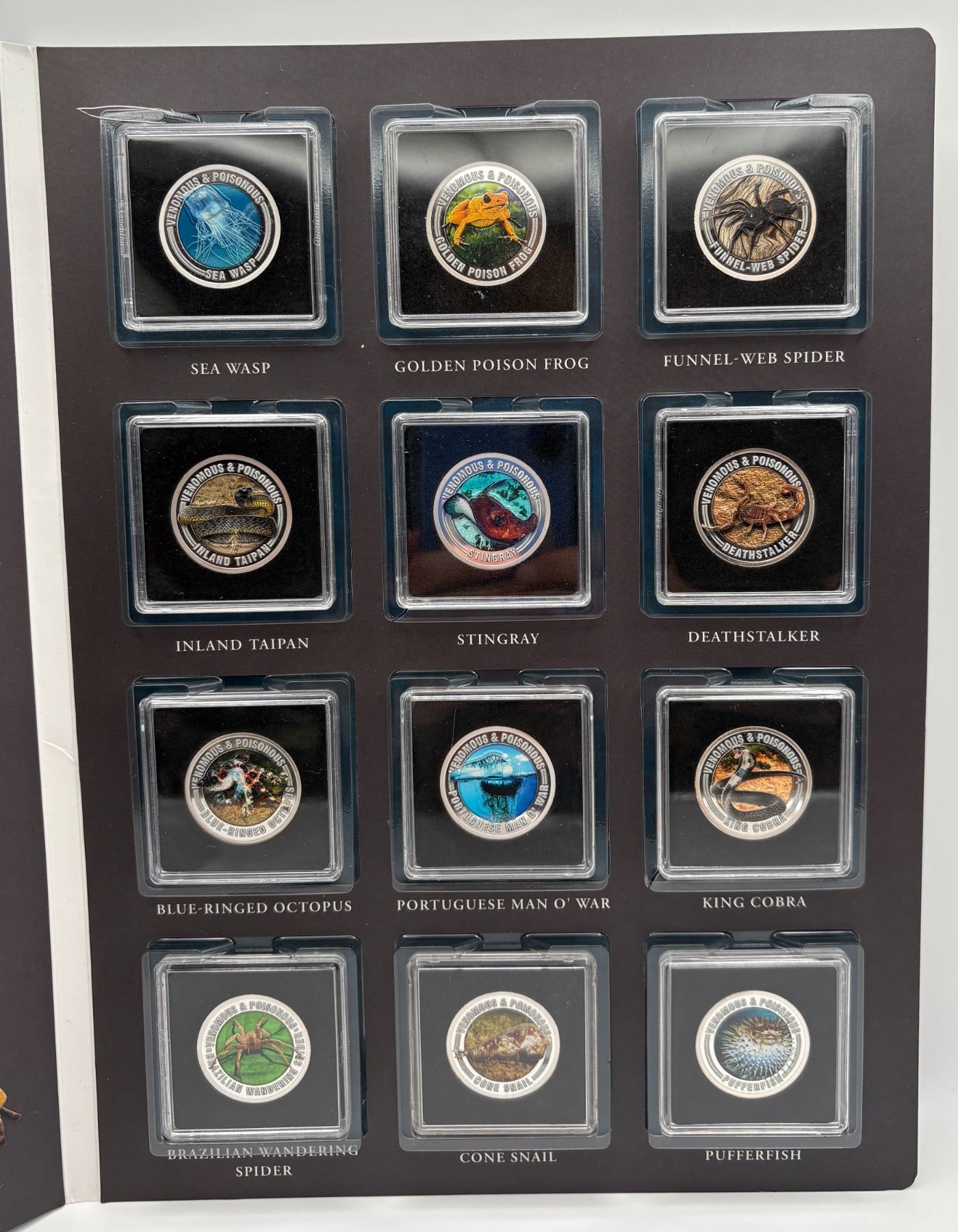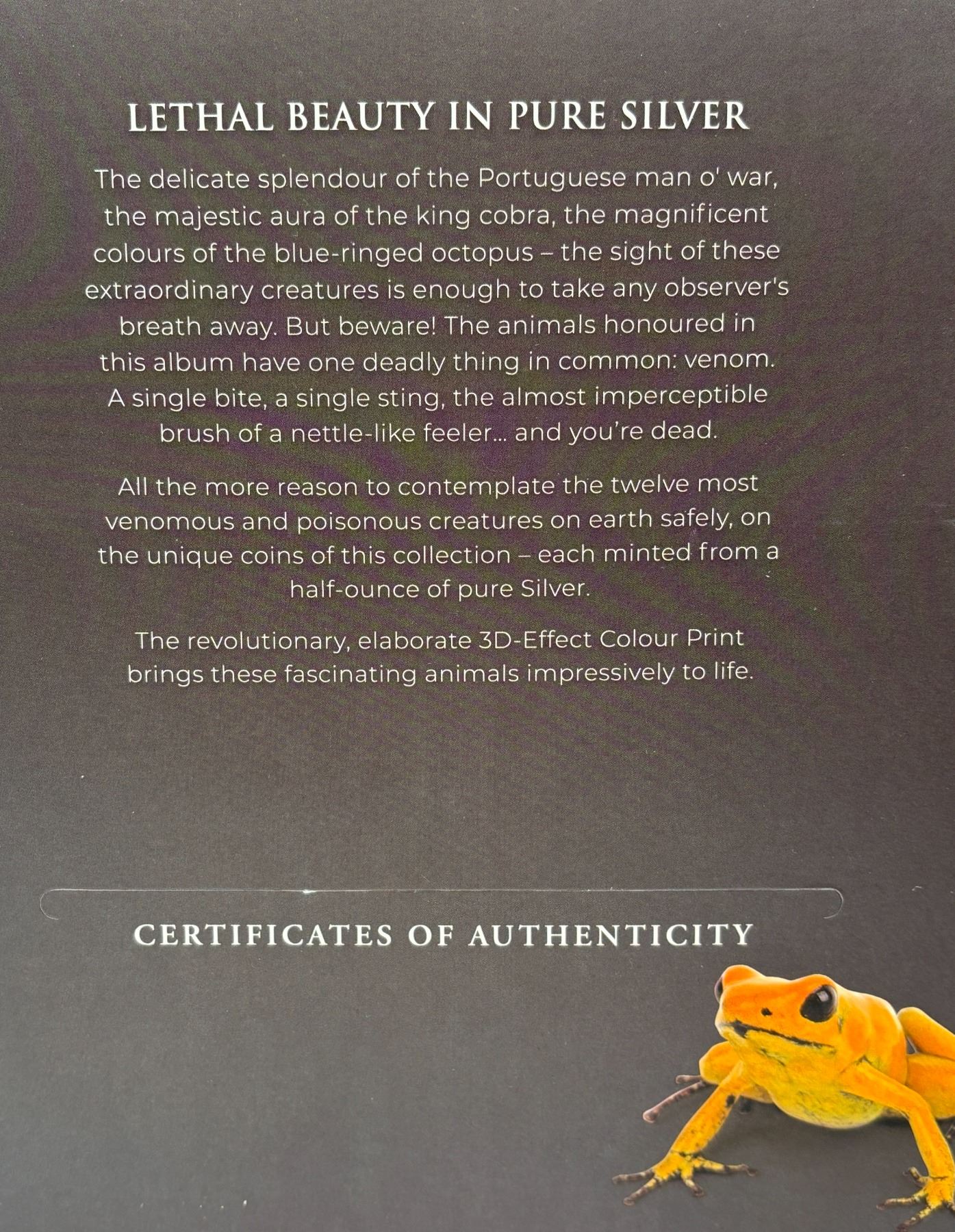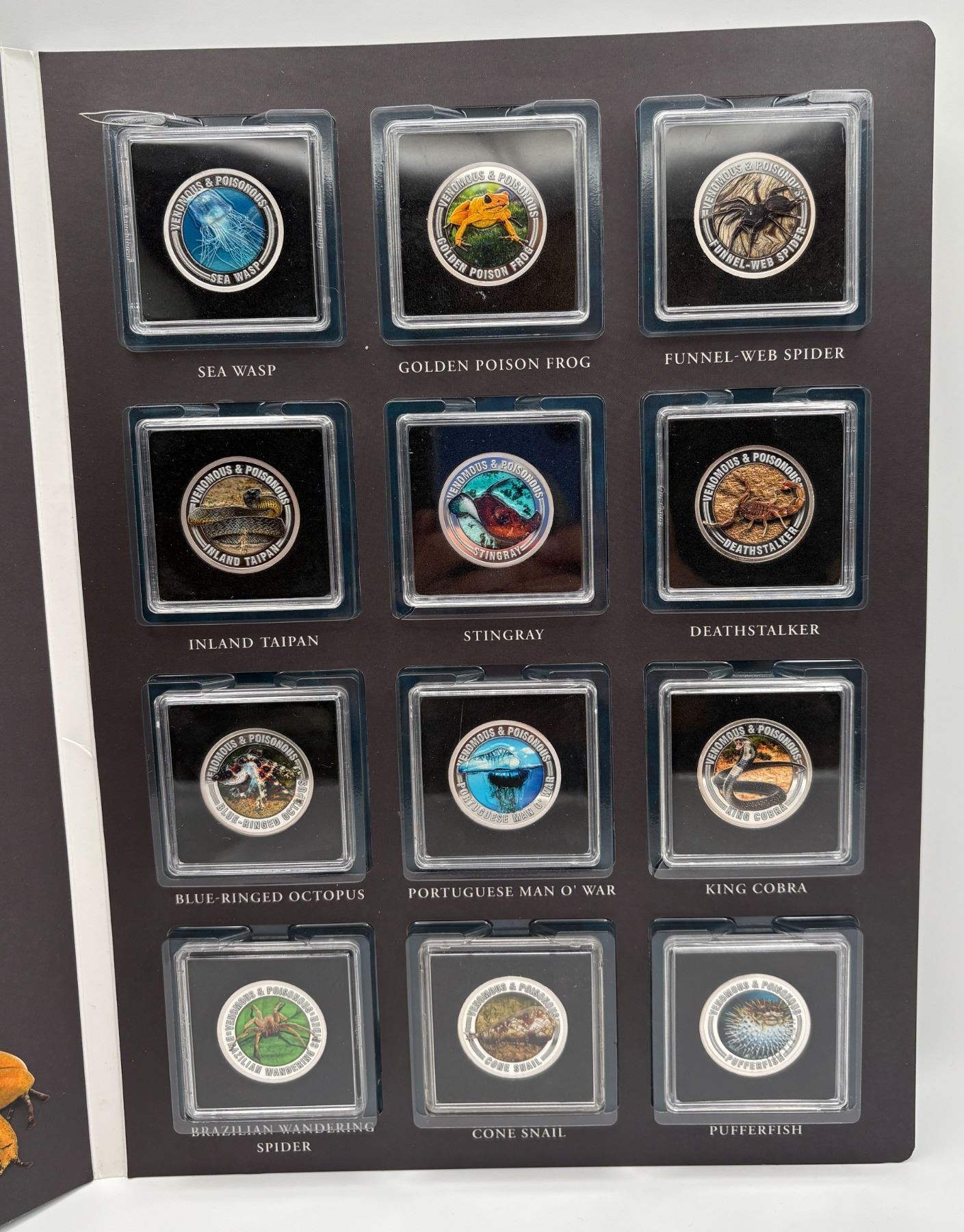 6 oz. 12 X Silver Proof-Like Coins In Quadrans In Folder. Coins are 1/2 Oz Ag 999 In Pure Silver. (Half Ounce Pure Silver). Includes the following, Sea Wasp, Golden Poison Frog, Funnel - Web Spider, Inland Taipan, Stingray, Deathstalker, Blue-Ringed Octopus, Portuguese Man O' War, King Cobra, Brazilian Wandering Spider, Cone Snail, Pufferfish.