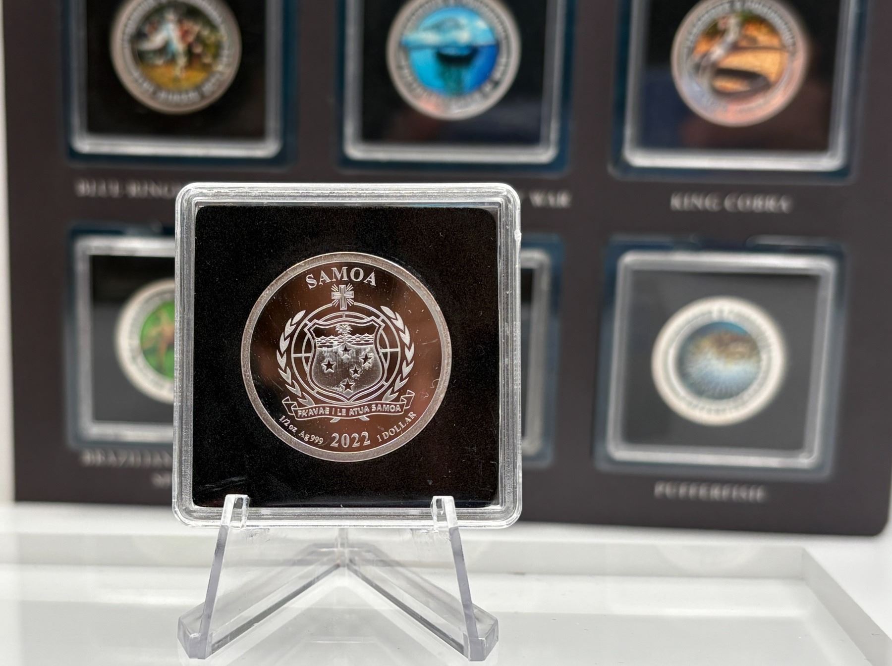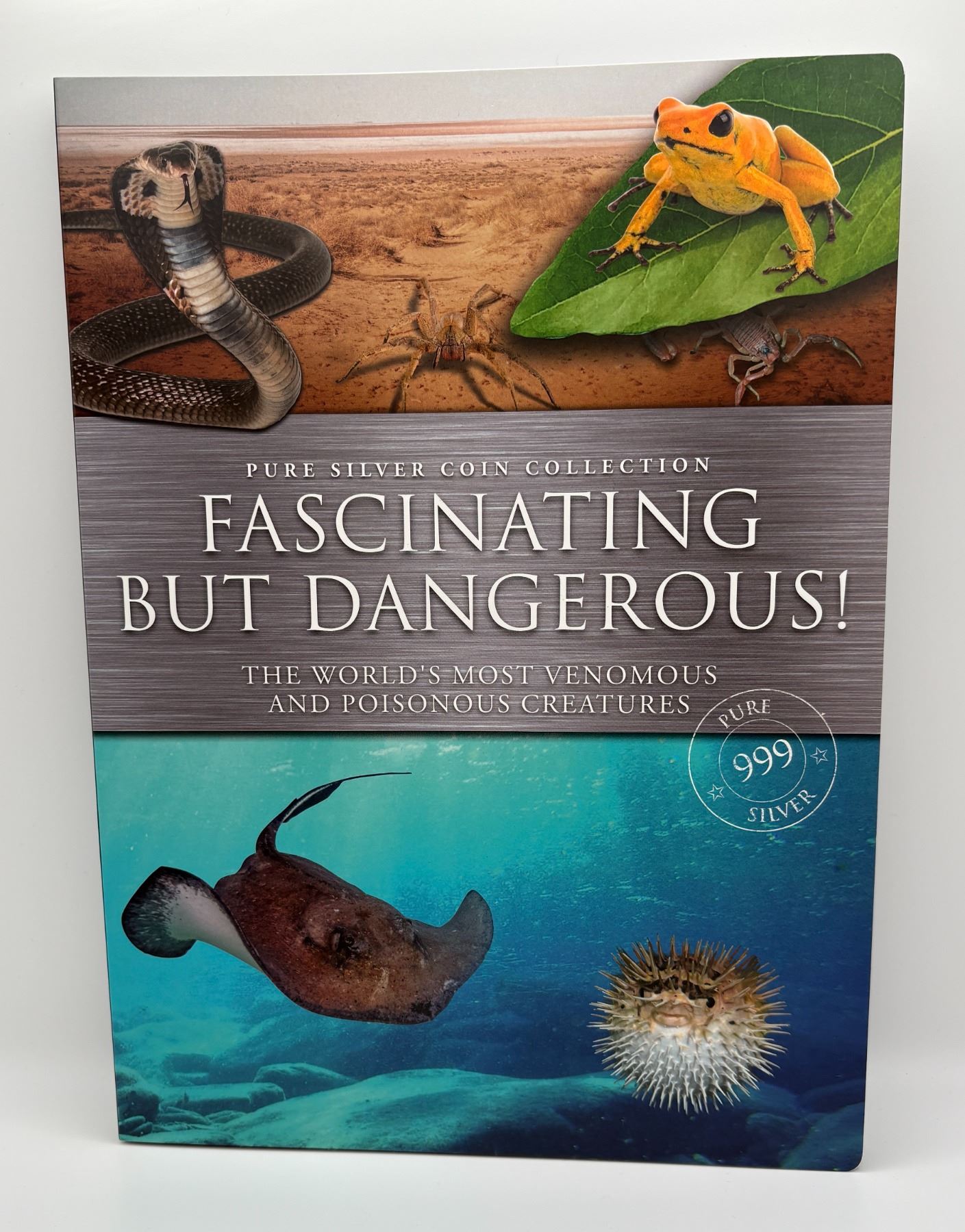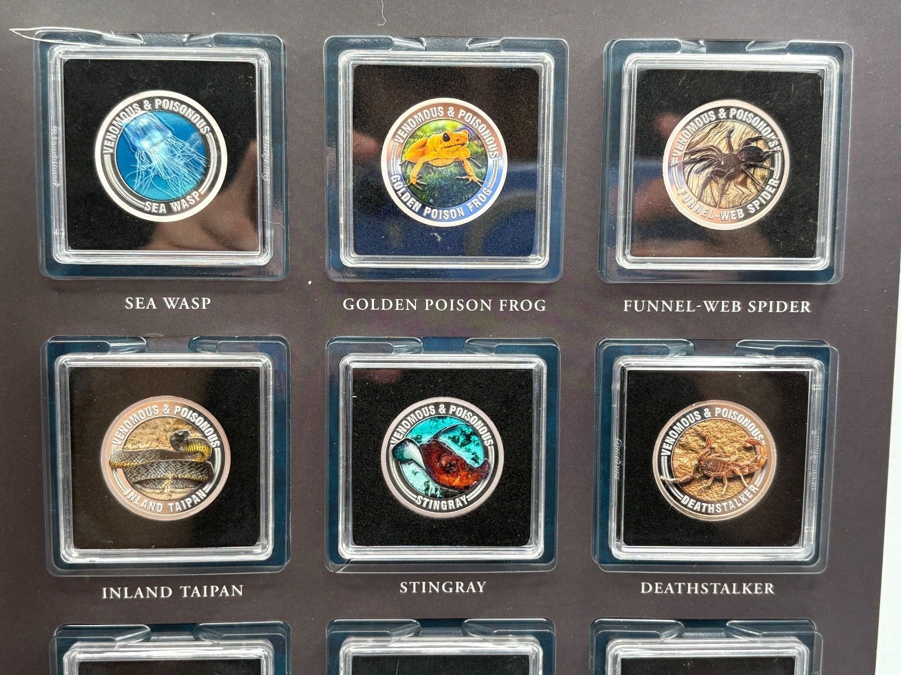 6 oz. 12 X Silver Proof-Like Coins In Quadrans In Folder. Coins are 1/2 Oz Ag 999 In Pure Silver. (Half Ounce Pure Silver). Includes the following, Sea Wasp, Golden Poison Frog, Funnel - Web Spider, Inland Taipan, Stingray, Deathstalker, Blue-Ringed Octopus, Portuguese Man O' War, King Cobra, Brazilian Wandering Spider, Cone Snail, Pufferfish.