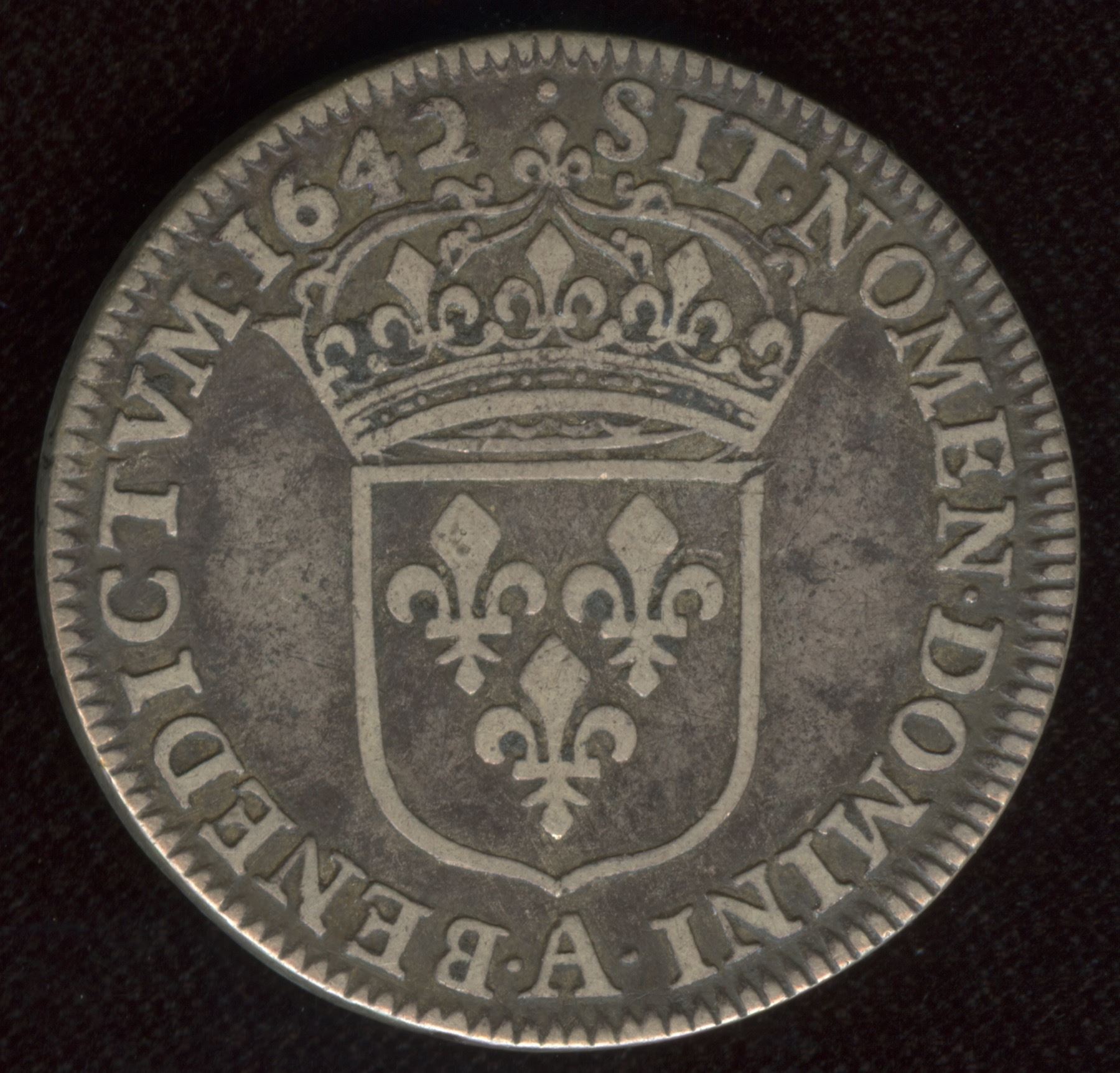 premier poinçon de Warin, Louis XIII, 1642A point, G & D 47. Attractive aVF, old obv. scratch in field.