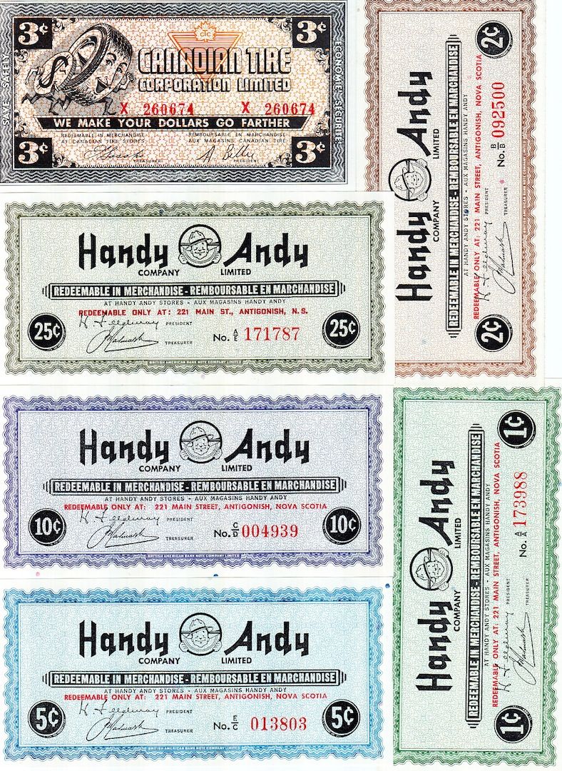 Scrip Lot - Lot includes: Handy Andy Auto Centre, Antigonish, Nova Scotia, 1,2,5,10 and 25 Cents. Canadian Tire 16 pcs. Good quality lot. Total 21 PCS.