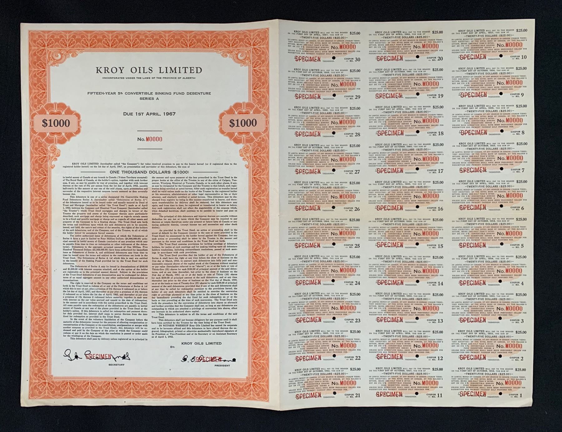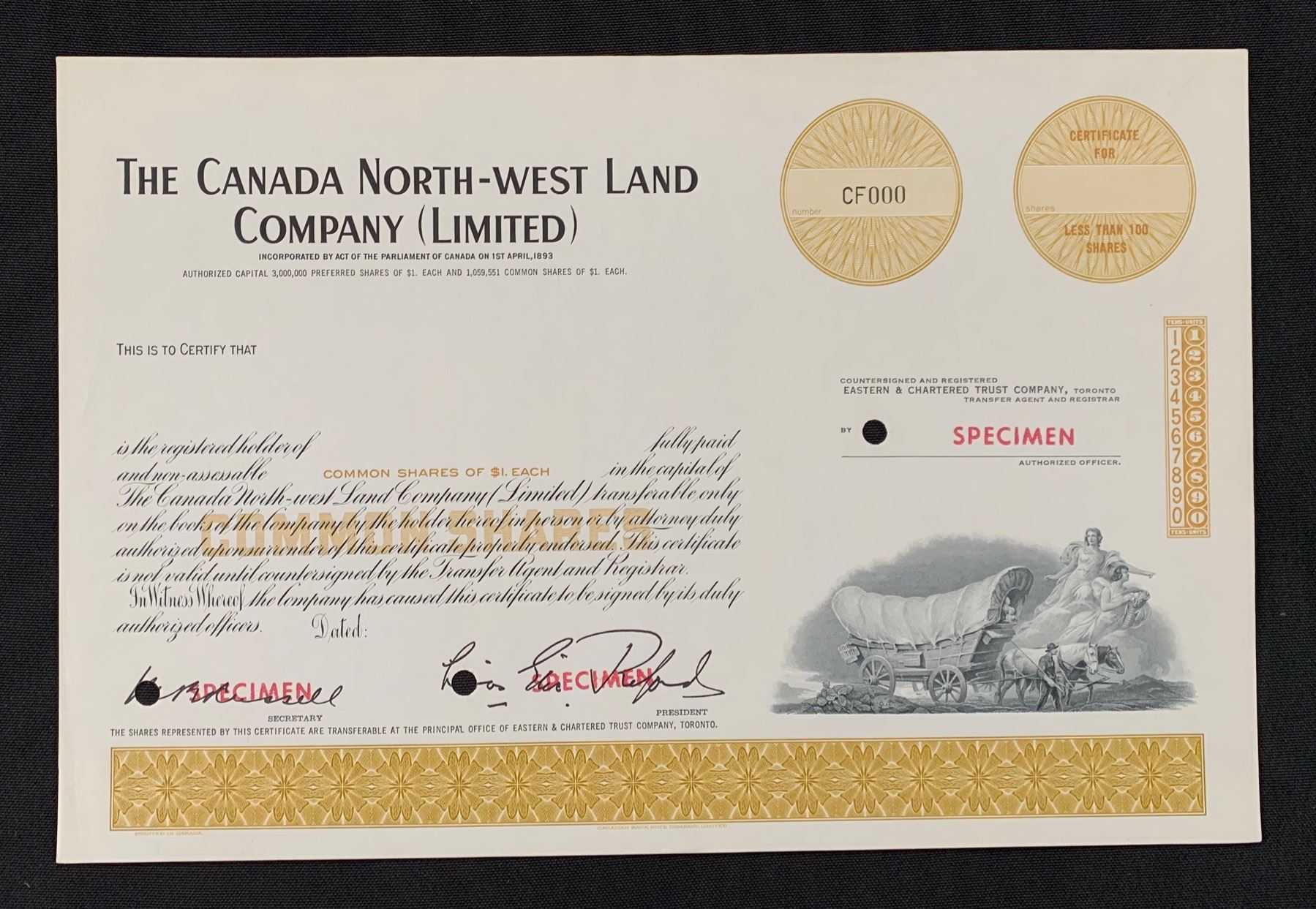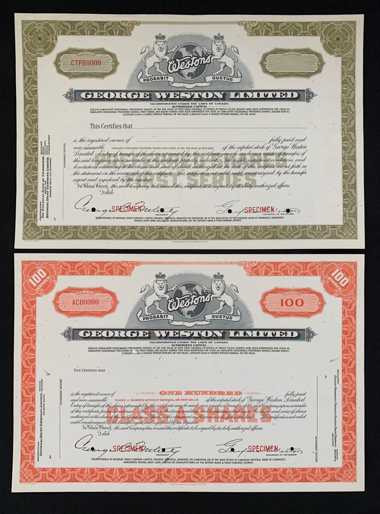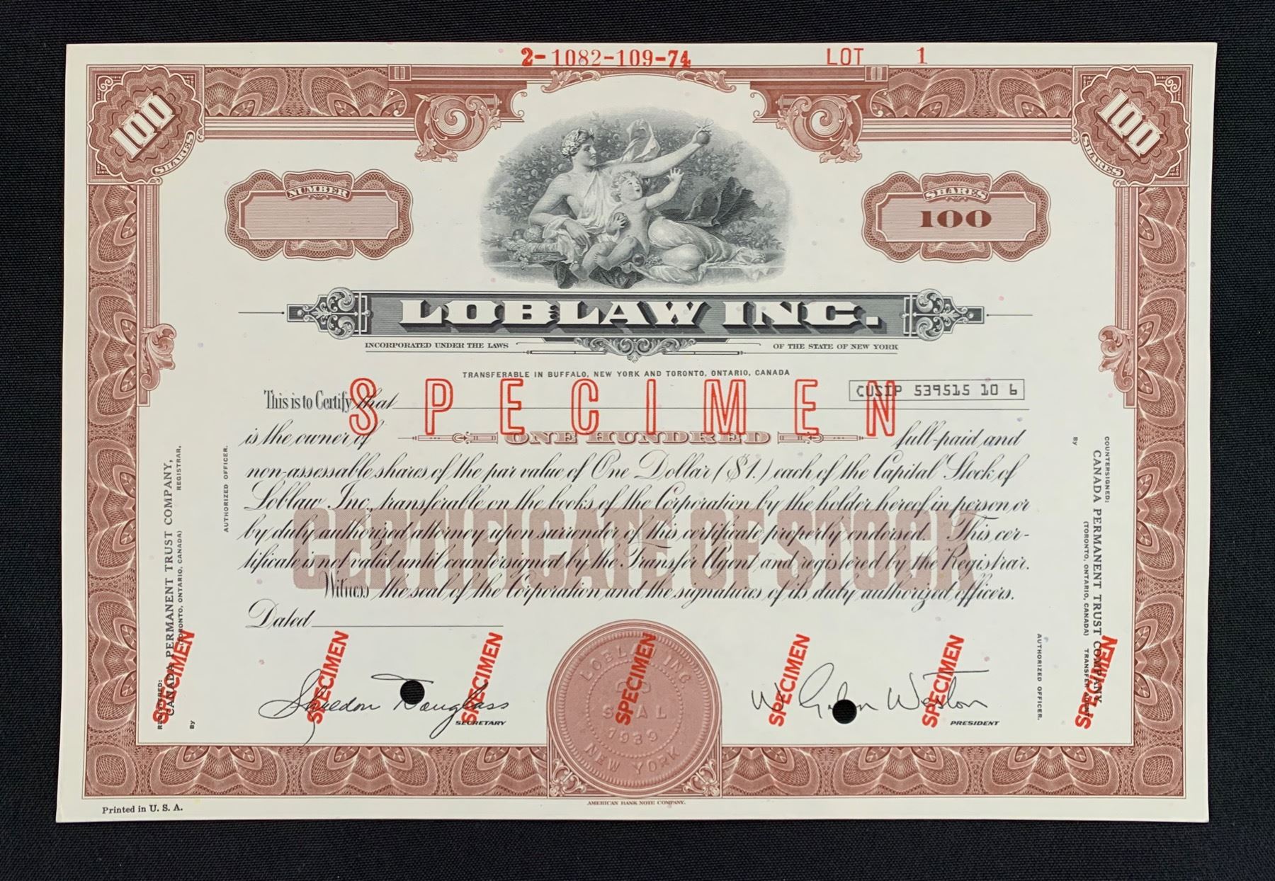Loblaw Inc. Share Certificate; George Weston Share Certificate, four different; Canada North-West Land Co. Share Certificate; Consumers' Gas Co. of Toronto, Debenture, 1954; Kroy Oils Debenture, , with thirty interest coupons attached. All but the last two have vignettes. The Loblaw document was printed by American Bank Note Co. and all the others by Canadian Bank Note Co.
