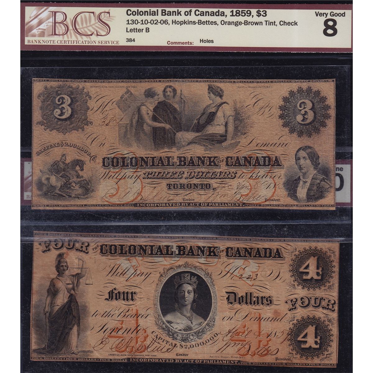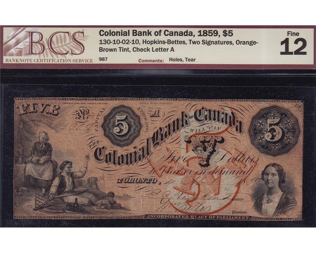 Set of 5, 1859 Colonial Bank of Canada $1-$5 - Includes: CH 130-10-02-02, BCS VF-20 Holes, Tears, Minor Missing Corner, S/N:806/B; CH 130-10-02-04, BCS Fine 15, Holes, S/N:1274/D; CH 130-10-02-6, BCS VG-8, Holes, S/N:384/B; CH 130-10-02-08, BCS VF-20, Holes, S/N:223/D; CH 130-10-02-10, BCS Fine 12, Holes, Tear, S/N:987/A. 5 Pcs.