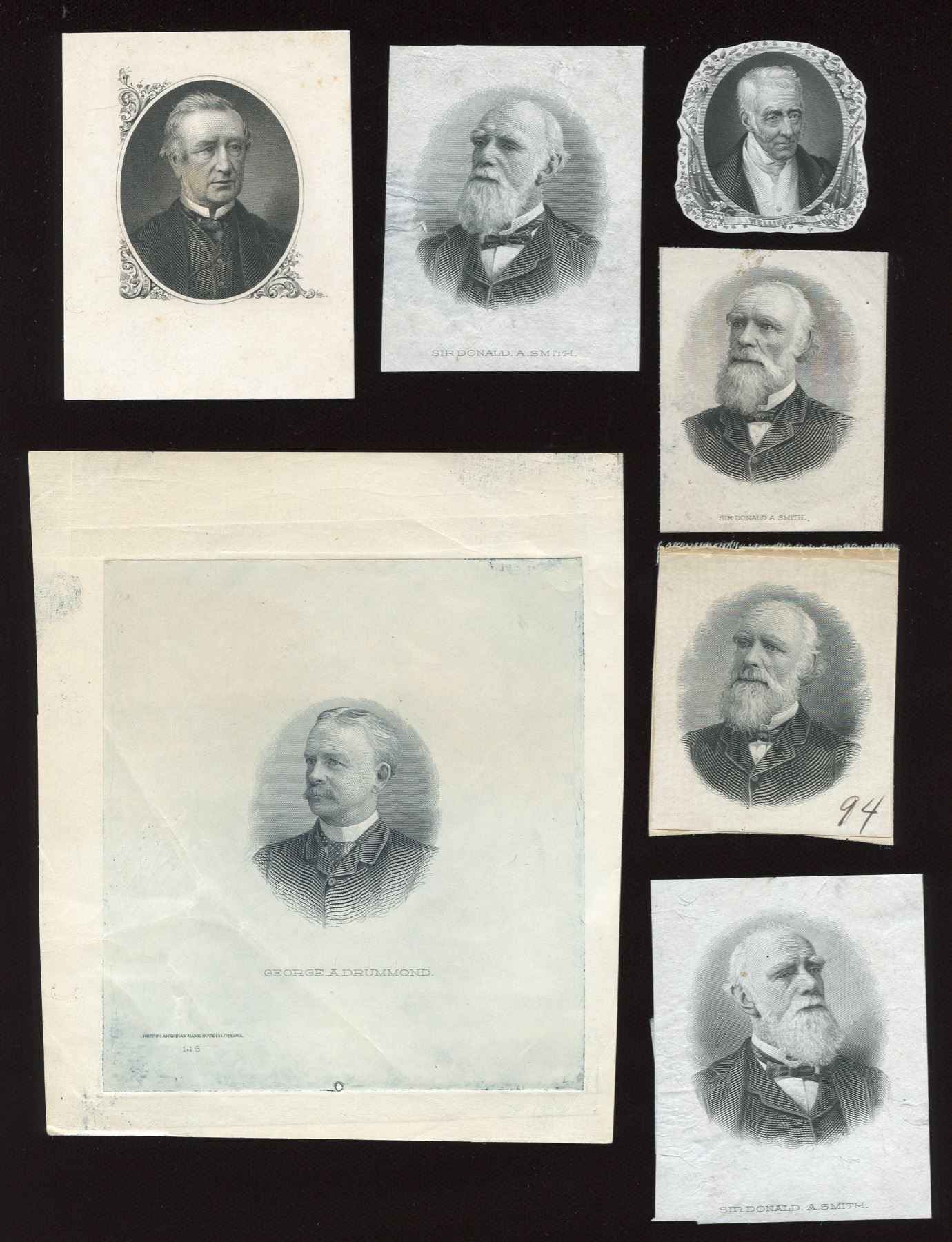 Bank of Montreal, portraits appearing on notes including Duke of Wellington (1859 $4), trimmed to design; Sen. Ryan (1871); Donald Smith, four different portraits of which two are similar but not quite identical; Geo. Drummond (1895). Total of seven engraved portraits. Lot also includes photograph of Sir Frederick Williams-Taylor, lower right corner torn off, and a reduced size copy, used by Marcus Baldwin in engraving the portrait found on all 1923 issue denominations; details written on the backs.