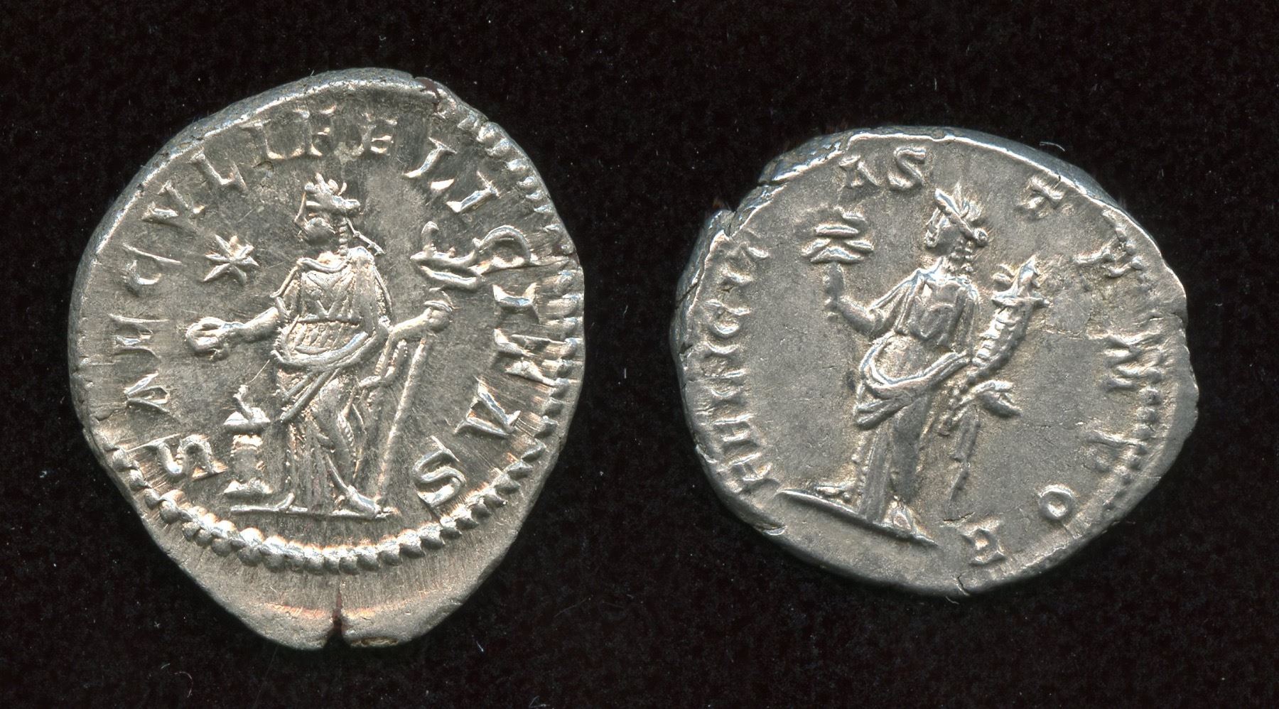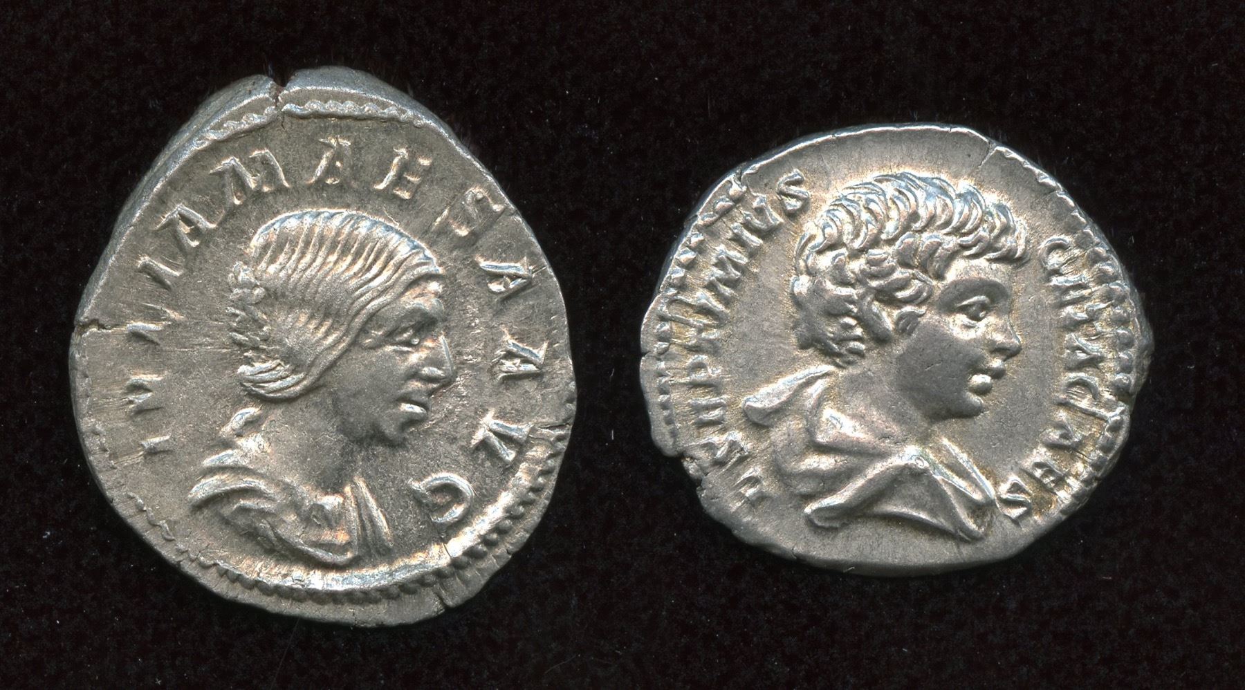 Geta, as Caesar (3.24g) Rev: Felicitas stg. l. holding caduceus and cornucopiae. RIC 95; aEF || Julia Maesa (3.11g) Rev: Felicitas stg. l., sacrificing over altar and holding caduceus. RIC 271; EF, with mint lustre. 2 Pcs.