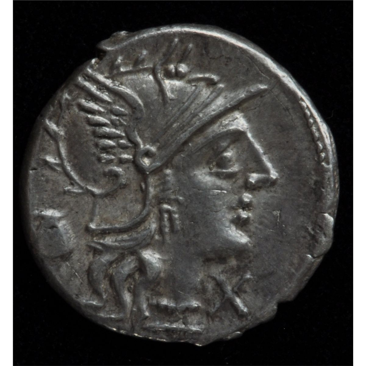 Sextus Pompius (137 BC) - AR-Denarius Rome mint Obv: Helmeted head of Roma X below chin, jug behind. Rev: She wolf suckling twins, fig tree in background with three birds, SEX POM on r., Roma in exerge, 3.9 grams S-112 Craw 235-1A. Toned EF.