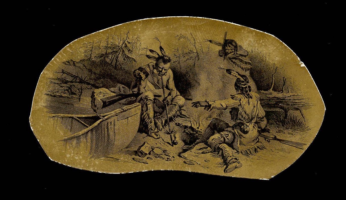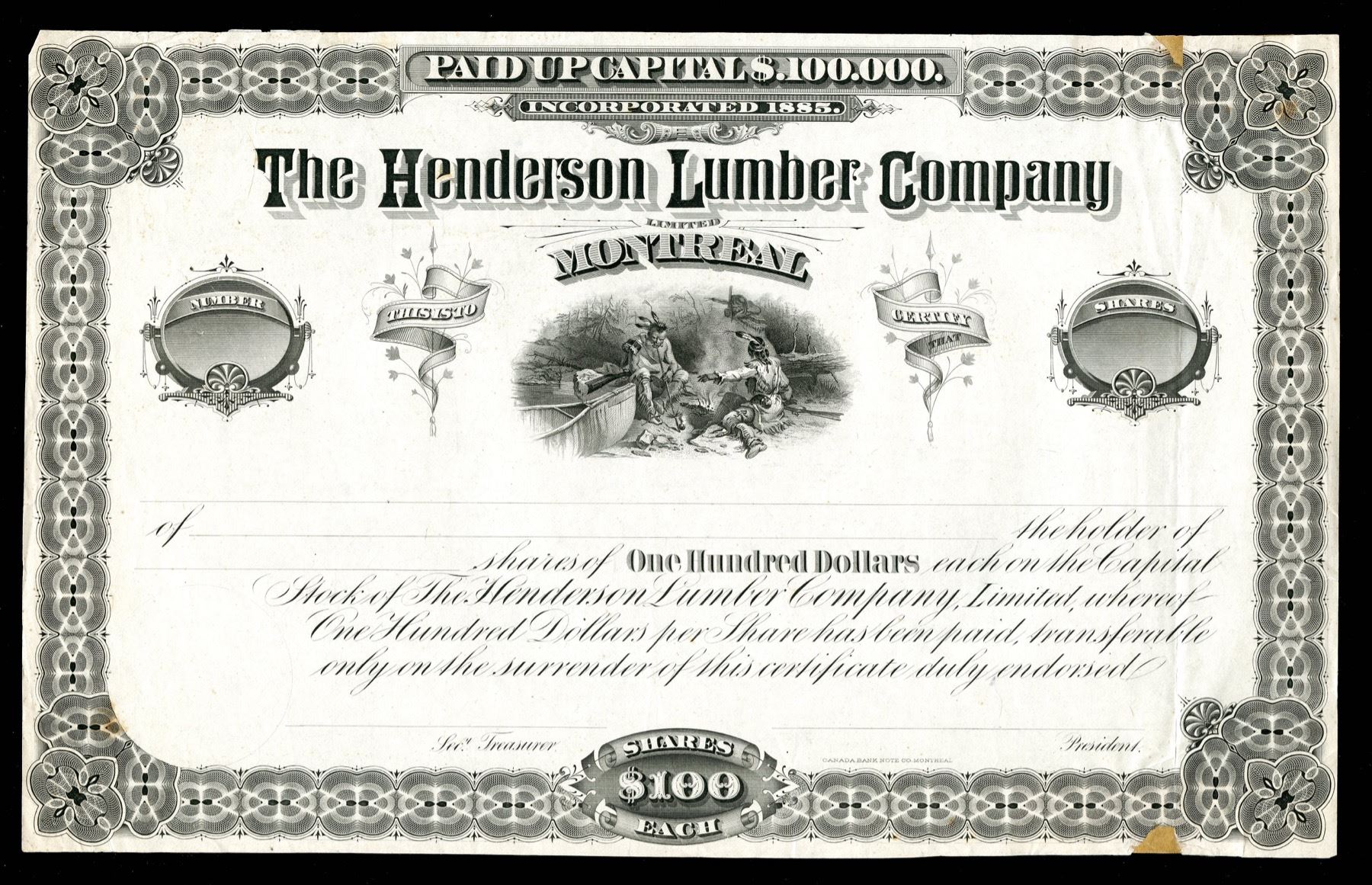 Henderson Lumber Co., Montreal, small marginal bits missing at top and bottom, mended on the back with gummed paper. The vignette at the centre features Indians in camp, after artist F. O. C. Darley. The same vignette is featured on the Commercial Bank of Manitoba $5 of 1885. An old photo of the vignette, cut out, is included.