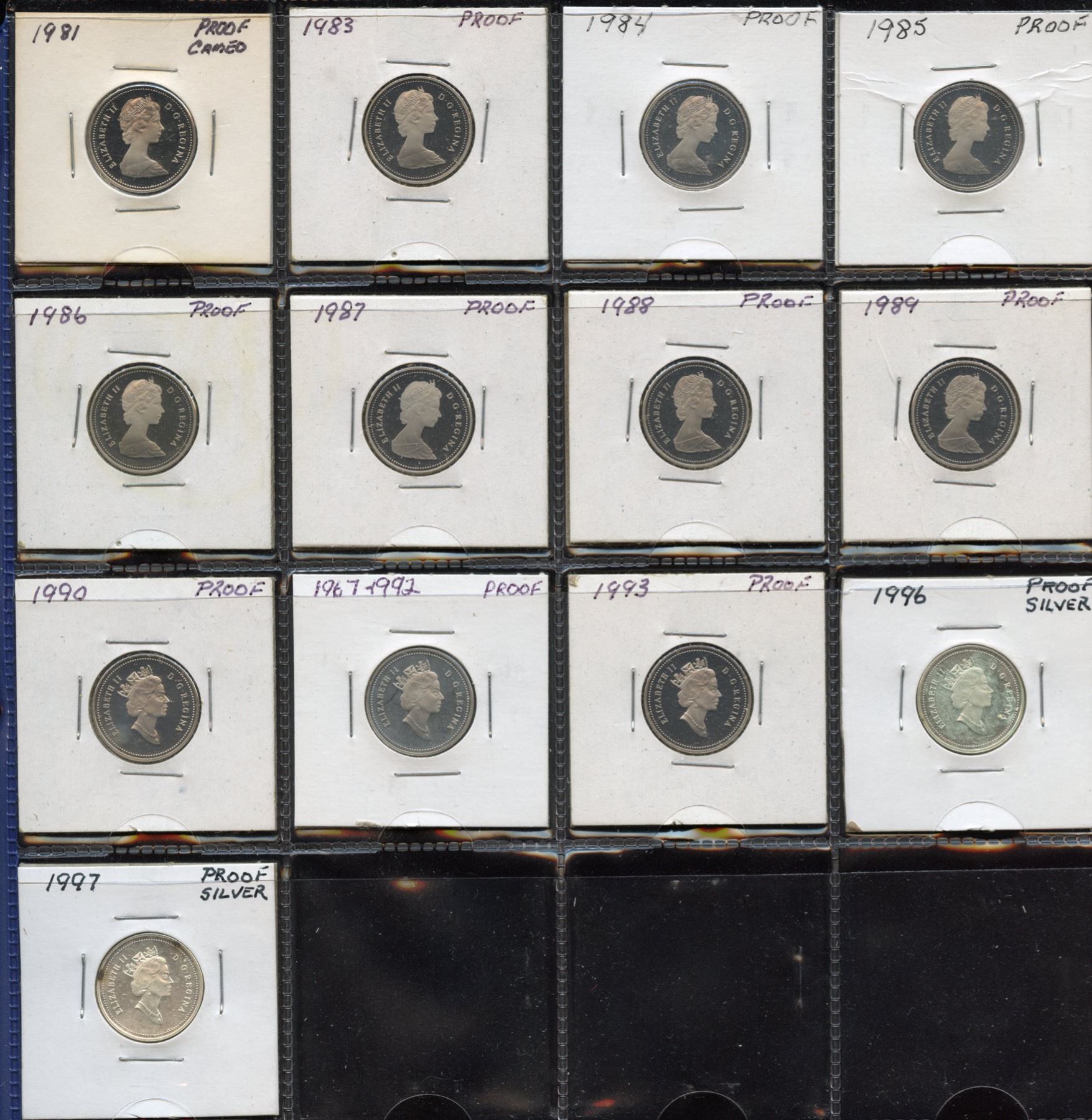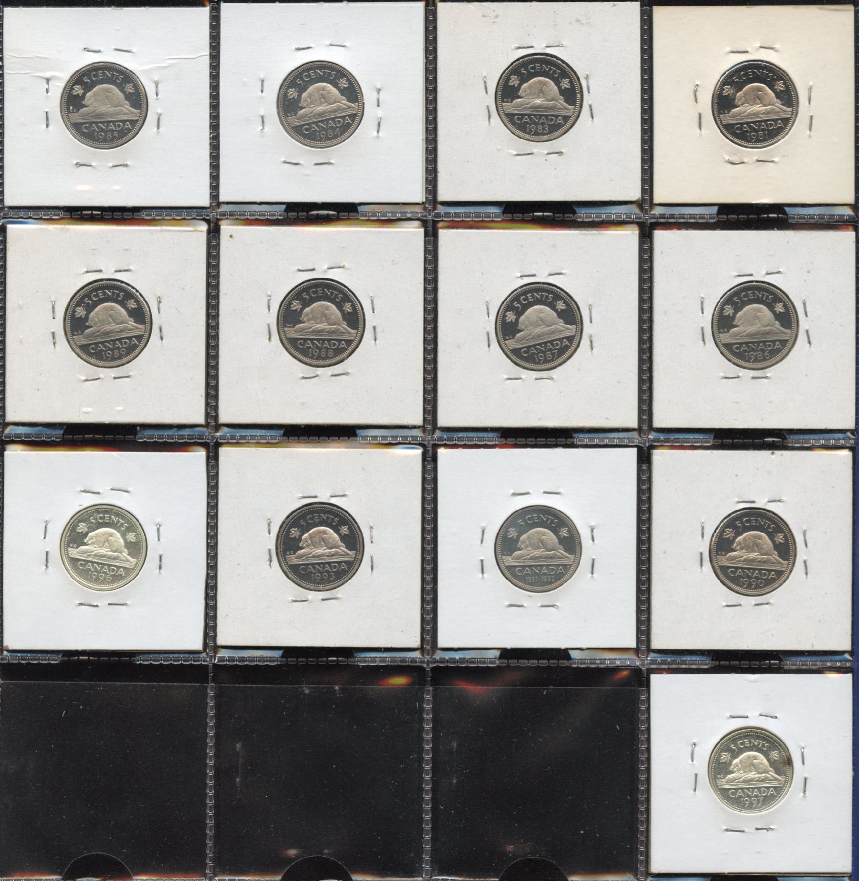 Short set of 13 5c Proof strikes, 1981-1997, includes two silver proof coins