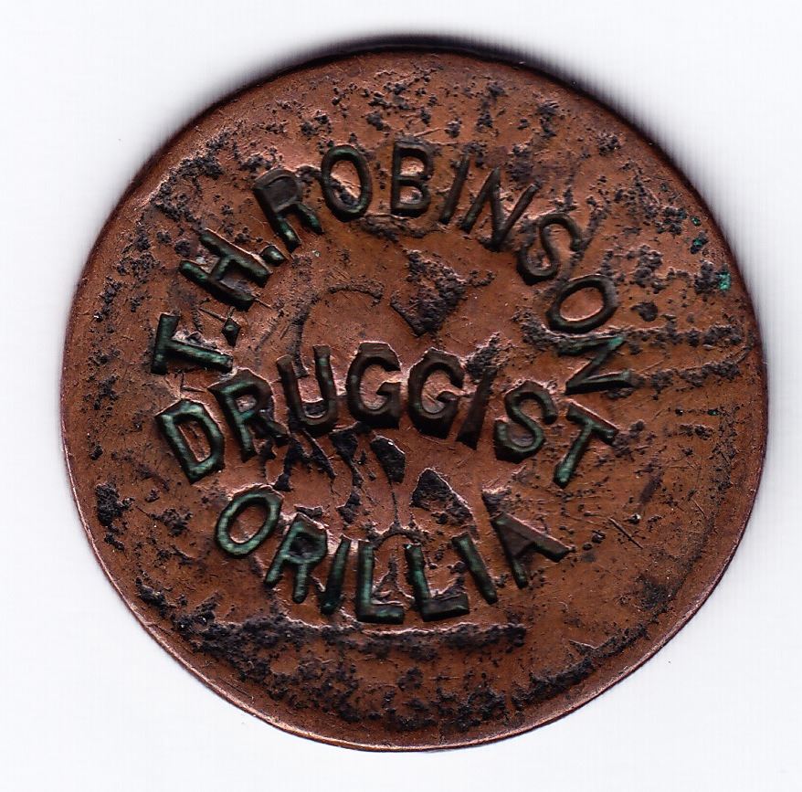 T.H. Robinson Druggist Orillia c/s on a worn Br 719. c/s VF and host token AG.