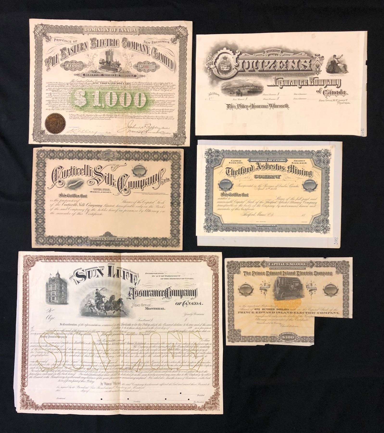 Six assorted financial documents printed by Canada Bank Note Co. Prince Edward Island Electric Co. Stock Certificate, lithographed in black with ochre tint, mounted on ledger paper, piece cut out from bottom; Citizens Insurance Company certificate in black, mounted on ledger paper, vignettes "Dominion Arms", "View of Montreal" and "Opulence"; Thetford Asbestos Mining Co. Stock Certificate, lithographed in black with yellow tint, mounted on ledger paper; Corticelli Silk Co. Stock Certificate, vignette of silk work on a leaf, couple small gummed paper repairs on back; Sun Life Assurance Co. certificate, lithographed in black with brown tint and attached to a strip of ledger paper at left, vignettes are office building and a charioteer driving four horses. Last but not least, an issued Toronto, Grey and Bruce Railway Co. £100 First Mortgage Bond 1884, printed in black with green tint, with red revenue stamps and company seal, train and ship vignettes, attractive despite minor faults such as irregular cut at bottom, numerous pinholes and one puncture; rubber stamp impressions on back are as recent as 1999 and 2001.