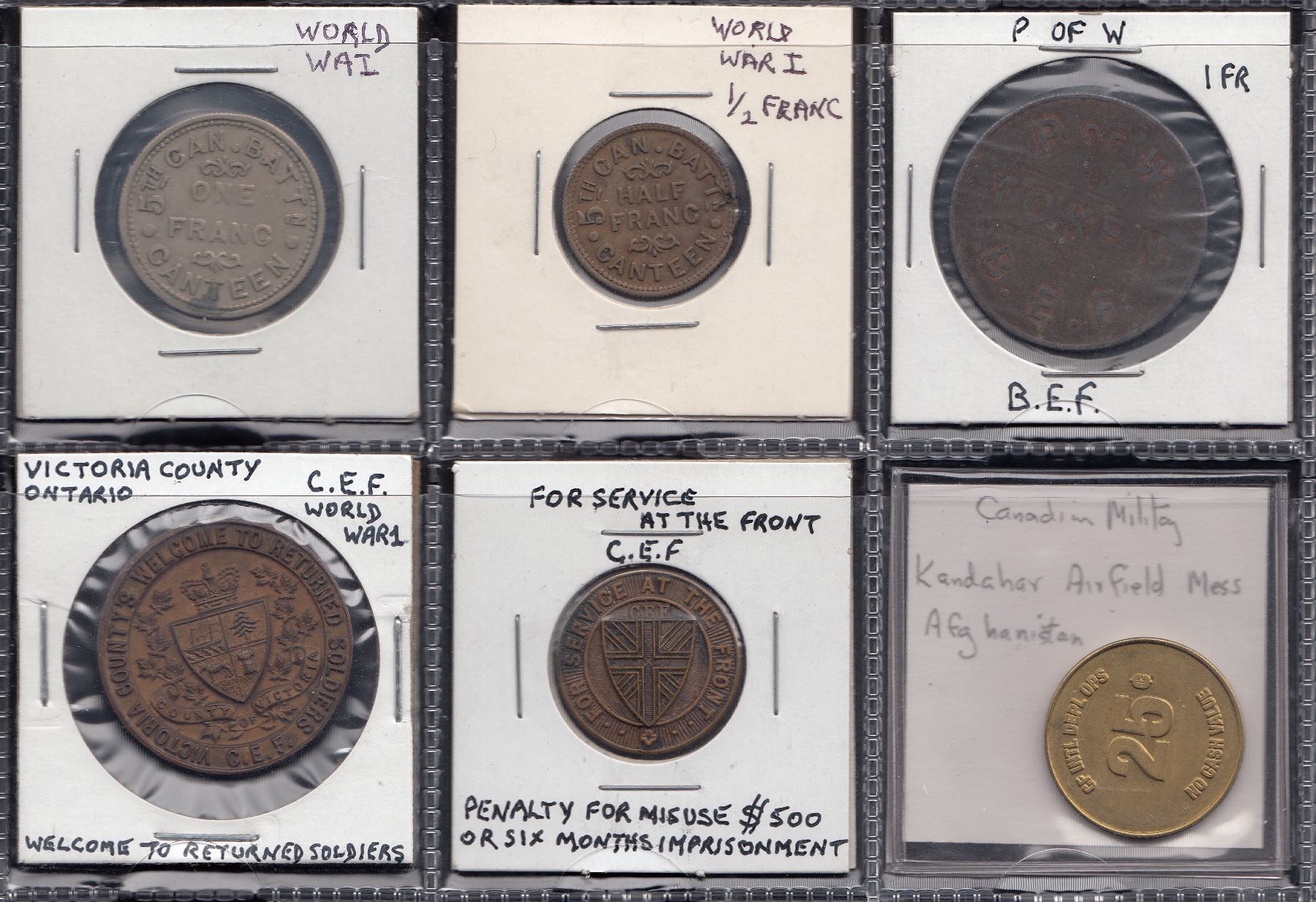 5th Can. Battn Canteen, 1 franc and 1/2 franc; POW Token BEF, 1 Fr.; Canada, Can Intl Depl Ops 25c, purportedly used in Afghanistan at Kandahar Airfield; Victoria County (Ontario) WWI Welcome Home medal; WWI "For Service at the Front" Badge, appears never to have been mounted as a pin. 6 Pcs.