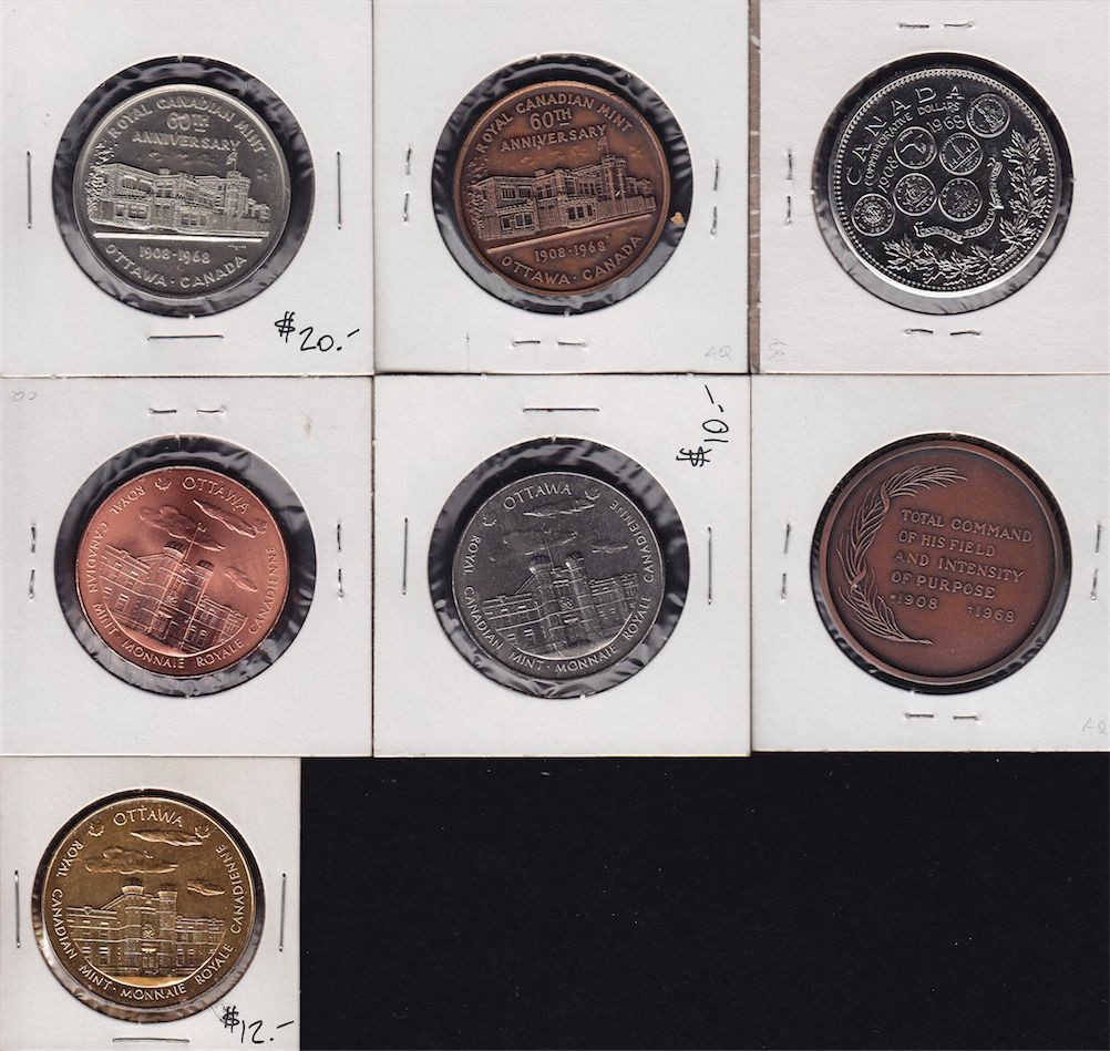 Small group of Seven Royal Canadian Mint related medals - 1 - Obv. Norval A Parker, Master of the Royal Canadian Mint 1959-1968 (bust of Parker). Rev. Total command/of his field/and industry/of purpose/1908 1968. Bronze, 40mm, AU/UNC. 2 - Obv, Ottawa Royal Canadian Mint Monnaie Royale Canadienne. Rev. Winnipeg Royal Canadian Mint Monnaie Royale Canadienne, three different metals (Ni, Cu, goldine). 3 - Obv. Honouring 60 years of numismatic excellence. Rev. Canada/Commerative Dollars/ 1918 1968 (6 commemorative dollars shown). Ni, 38mm, UNC. 4 - Obv. Royal Canadian Mint/60th/Anniversary/Mint building illus./1908-1968/Ottawa Canada. Rev. Canadian Coins/Superior workmanship/the highest standards of quality/illus. hand with money/some are rare/some common. Ni, 38mm, AU/UNC. 7 Pcs.