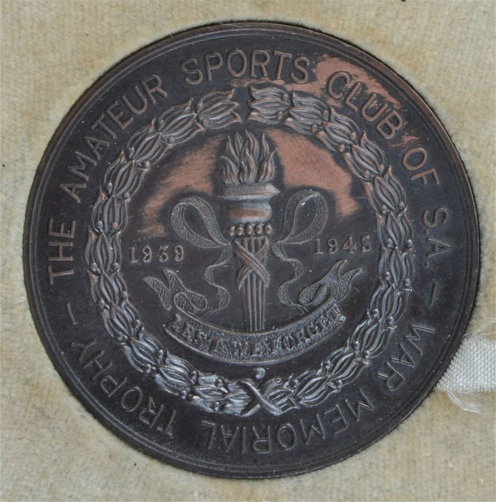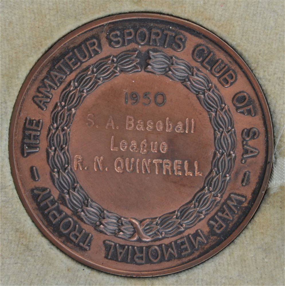 50mm, Copper. Obv. The Amateur Sports Club of S.A. War Memorial Trophy with center torch 1939-1945; Rev. The Amateur Sports Club of S.A. War Memorial Trophy 1950/ S.A. Baseball/ League/ R.N. Quintrell. Unc in case of issue.