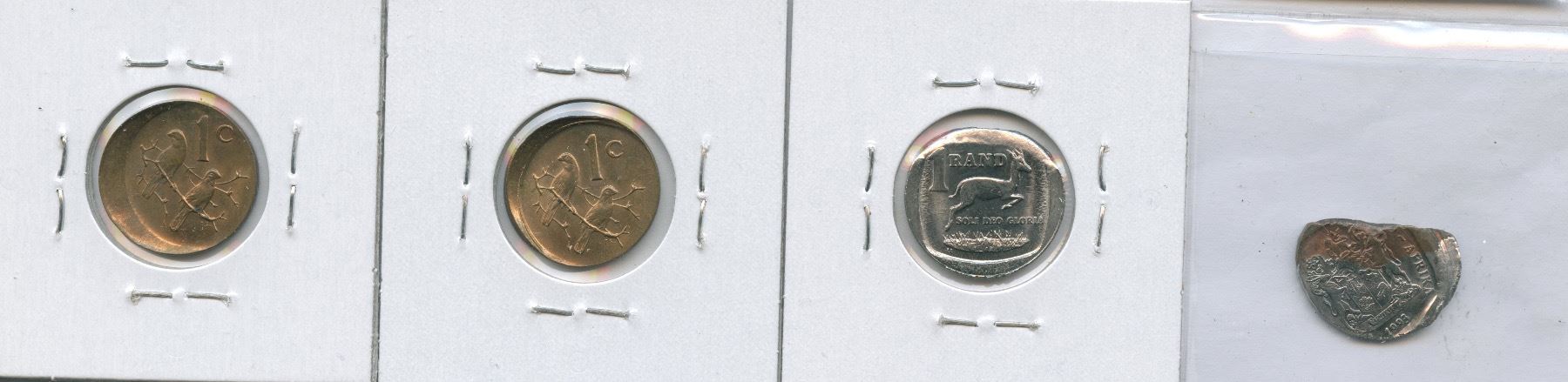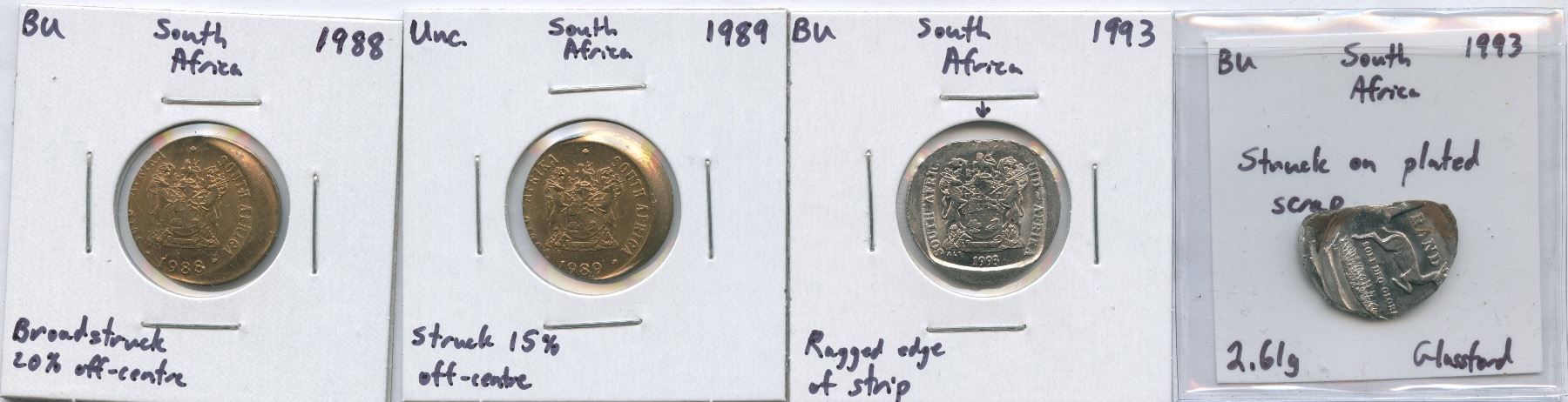 Lot of 4 South Africa errors, 1988 to 1993. All coins are uncirculated, with one spectacular 1 Rand error struck on a piece of scrap with plating errors. Patrick Glassford Collection.