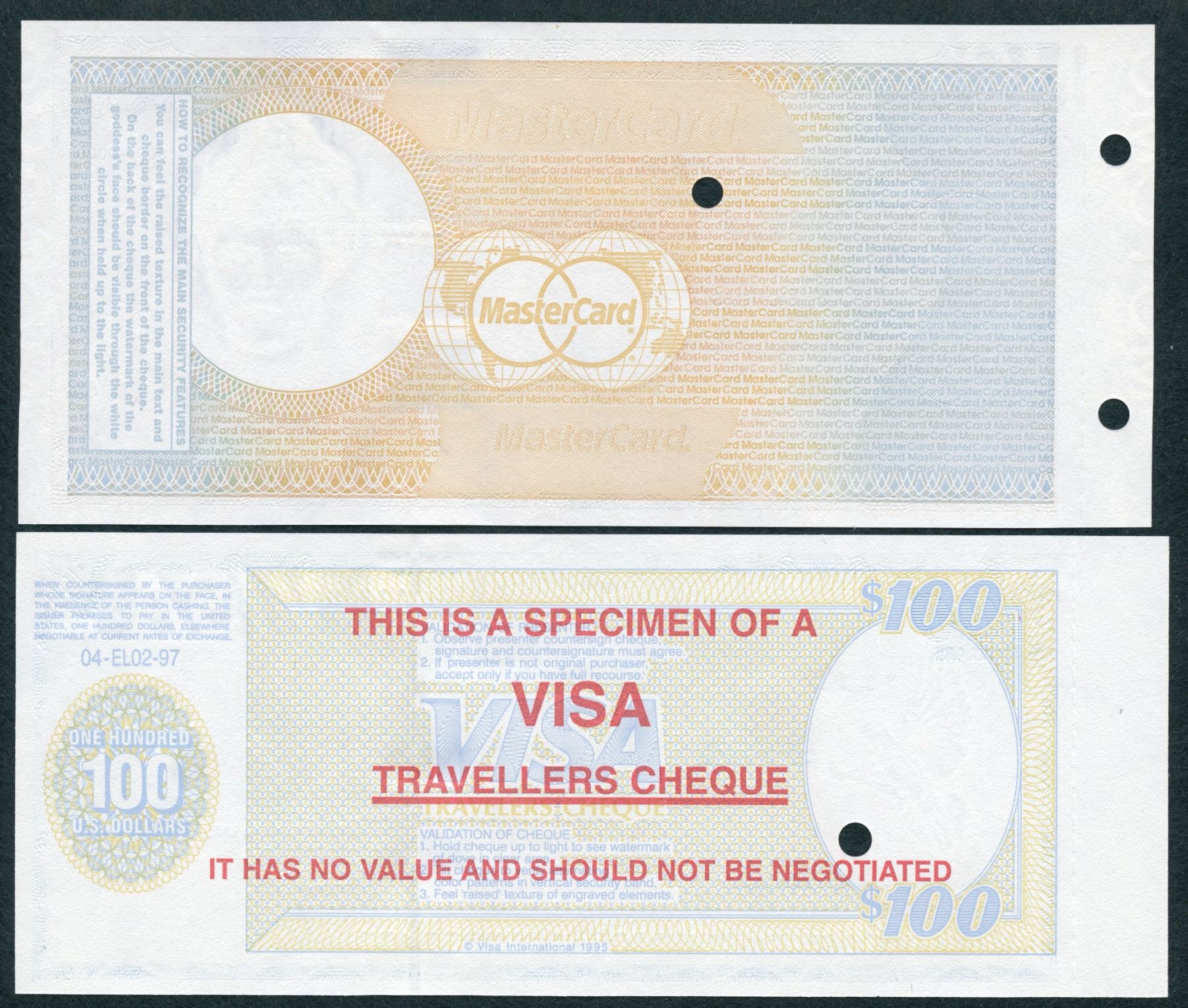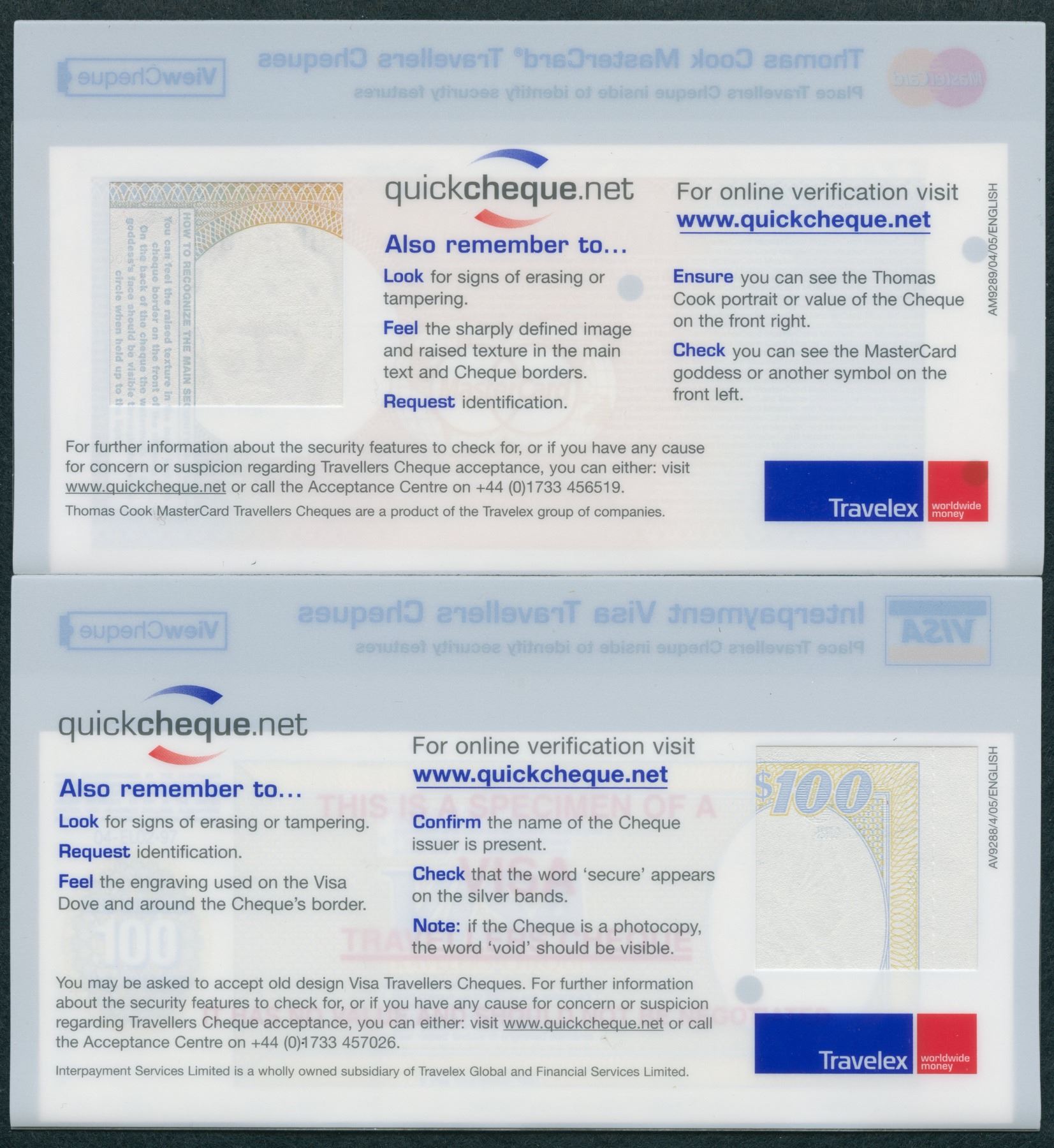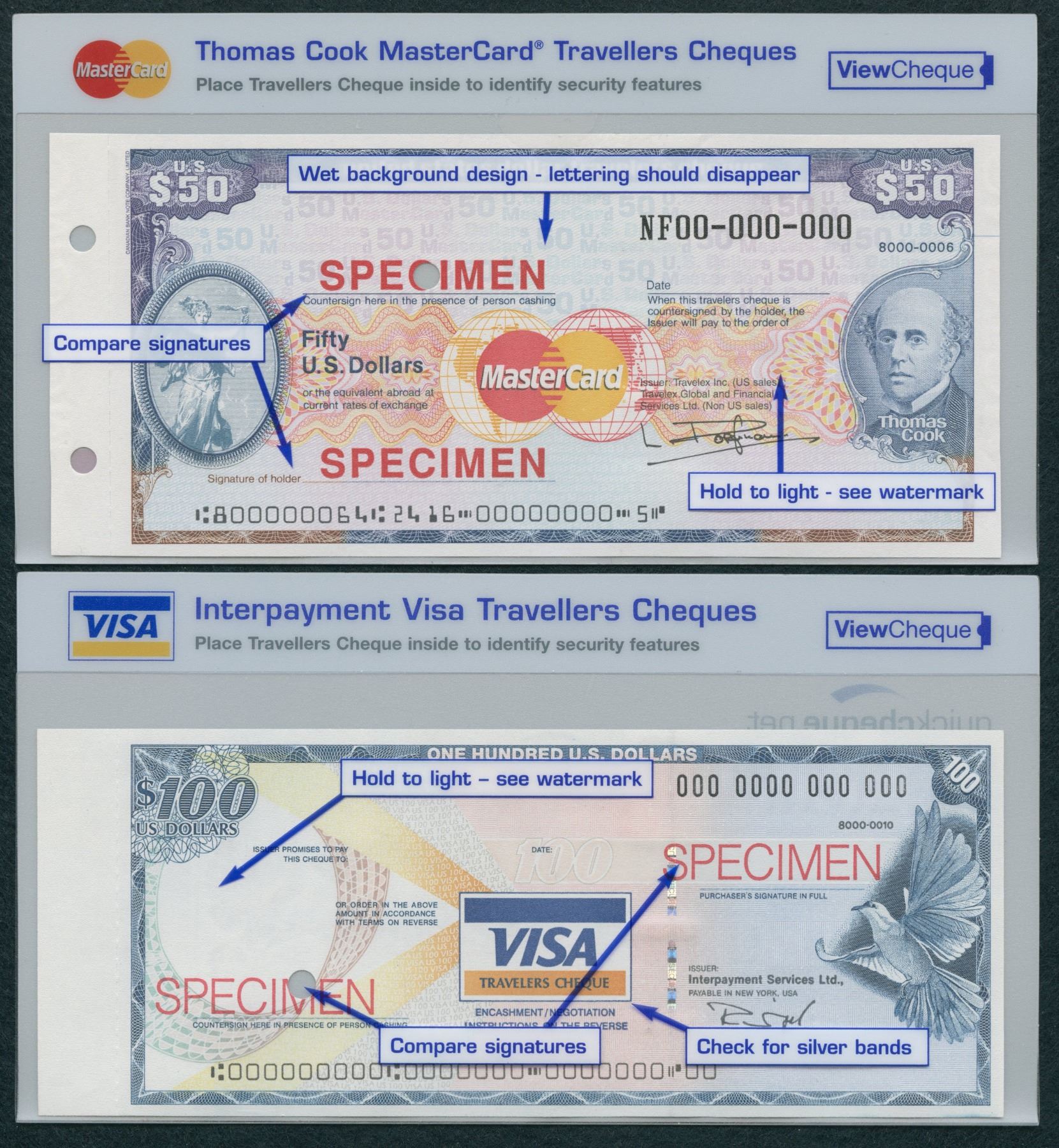 $50 Thomsas Cook MasterCard & $100 Interpayment Visa Specimen Travellers Cheques. Both cheques are housed in a ViewCheque holder by quickcheque to help identify the security features present by Travelex worldwide money. Printed on security paper with textured embossing. Uncirculated. 2 Pcs.